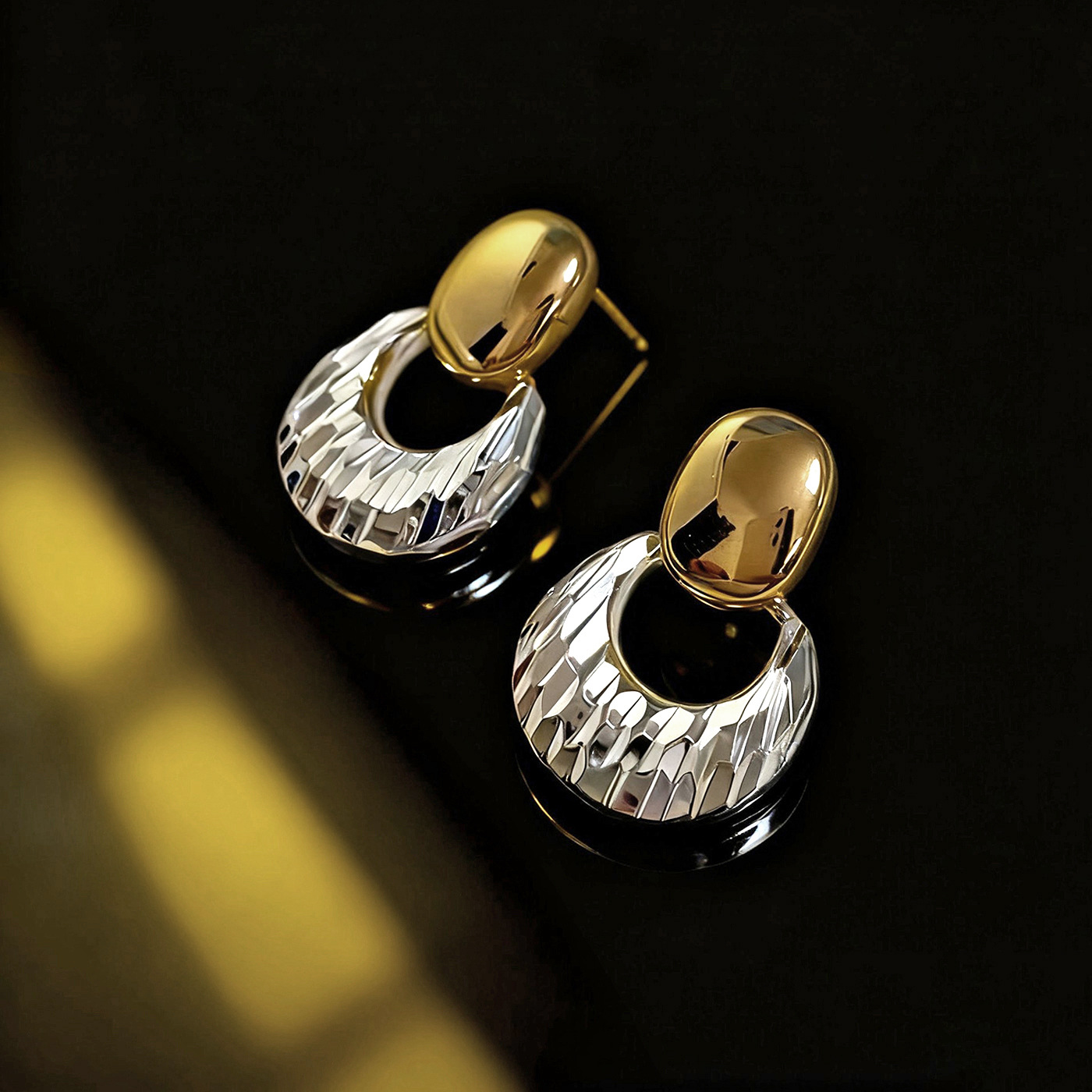 法式简约复古高级金属双色格纹耳钉小众设感耳坠时尚个性耳饰女