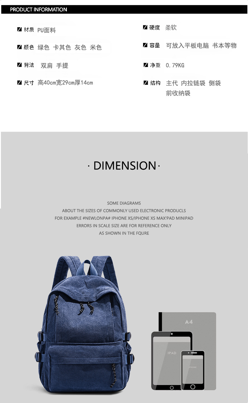 新しいコーデュロイ大学生バックパック女性の大容量スクールバッグ中学生無地シンプルな旅行バックパック男性と女性のため