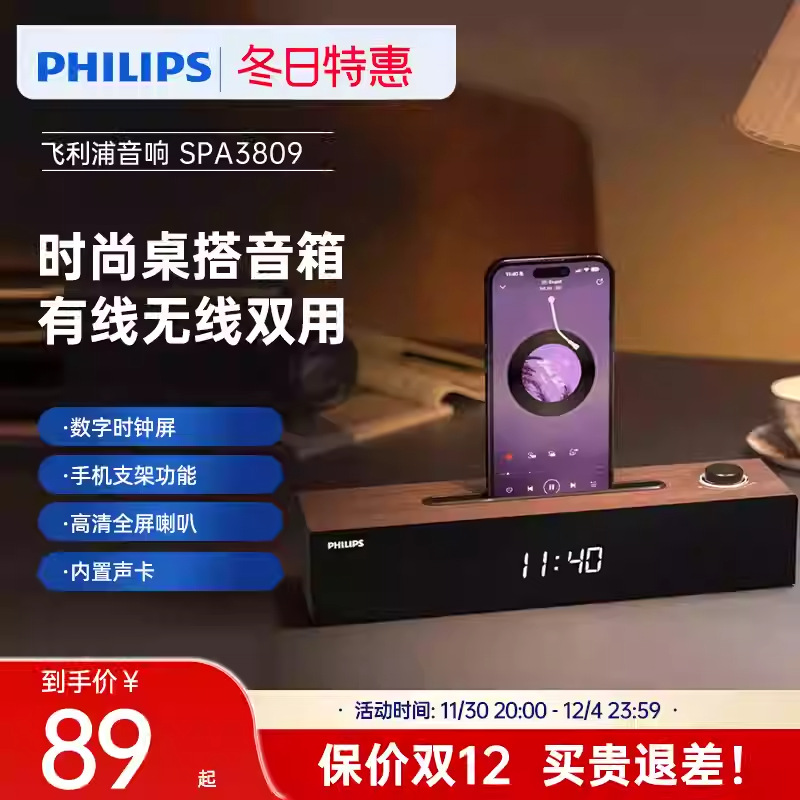 フィリップス SPA3809 コンピュータオーディオ Bluetooth スピーカーデスクトップ木製時計ホームオフィスゲーム USB