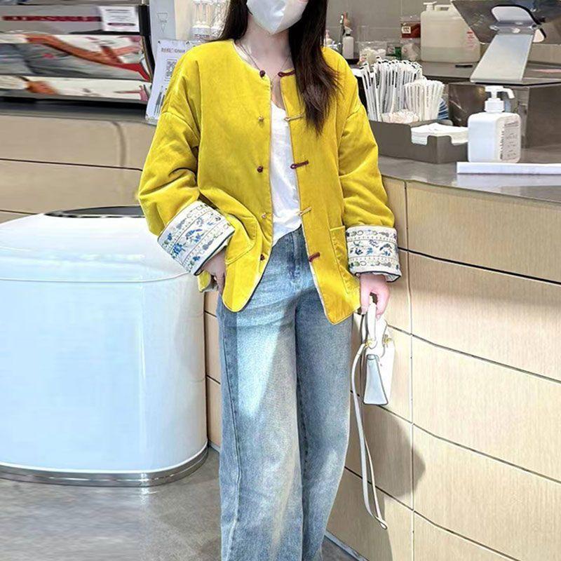 新中国式軽国風盤ボタン綿黄色コート女2024年秋冬新作中国風気質流行
