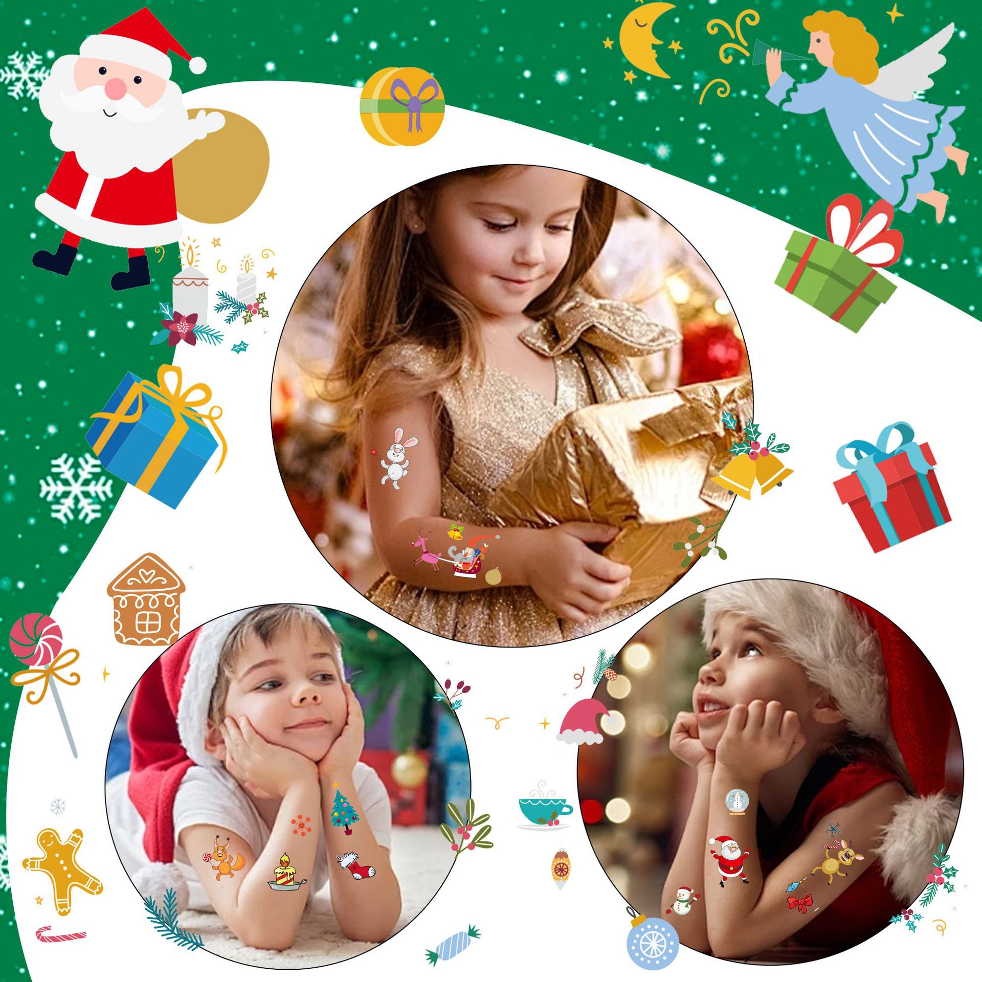 個性的なクリスマスの夜の光の刺青は子供の漫画のアイデアの臨時の刺青を貼って祝日の集まりの発光の刺青を貼って貼ります。