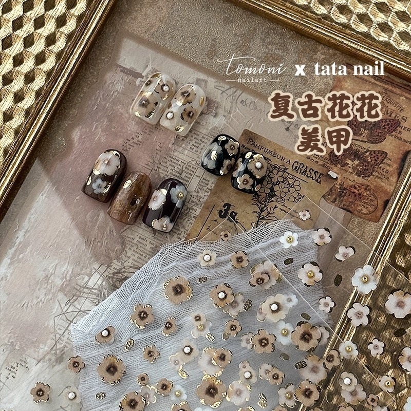 复古花花美甲贴纸烫金晕染小花老钱风高级感珍珠五瓣花指甲贴装饰