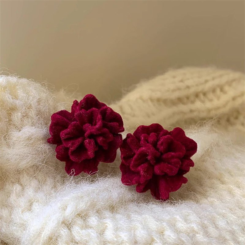秋冬の気質バーガンディ植毛ローズティーマウンテンフラワーイヤリングフレンチレトロハイエンドシンプルで多用途な女性用イヤリング