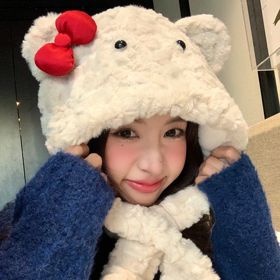 馨帮帮原创加厚保暖护耳帽子围巾一体冬季蝴蝶结小熊毛绒雷锋帽女