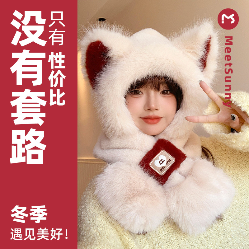 MEETSUNNY可爱帽子围巾一体秋冬季加绒围脖防寒保暖毛绒护耳帽