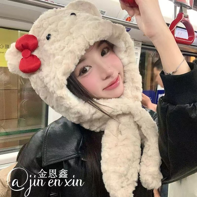 可爱蝴蝶结小熊毛绒帽子女冬季围巾帽子一体加厚防风保暖雷锋帽