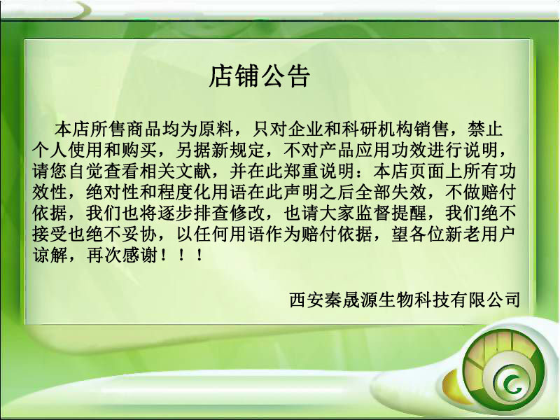 【质量条款】:部分产品可发放10g小样,供检测,检测通过即发货;或每批货我们都有自已的检测报告COA附寄,产品质量严格按检测标准执行,如收到货后,经检测含量或菌检不合格,可协洽我司退换货.但据多年的出口生产经验来查,我司所有产品没有出现过此种情况。