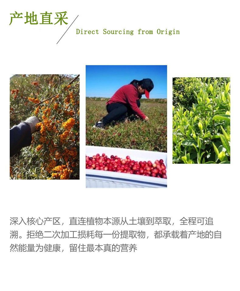 【原料采集】:我们的沙棘果采用 是新疆 南疆和北疆地区的沙棘,是沙棘的原生地。这些地区,远离工业污染,而且新疆四季分明,昼夜温差大,光照时间长,造就了沙棘的品质优良,各种营养成分含量。