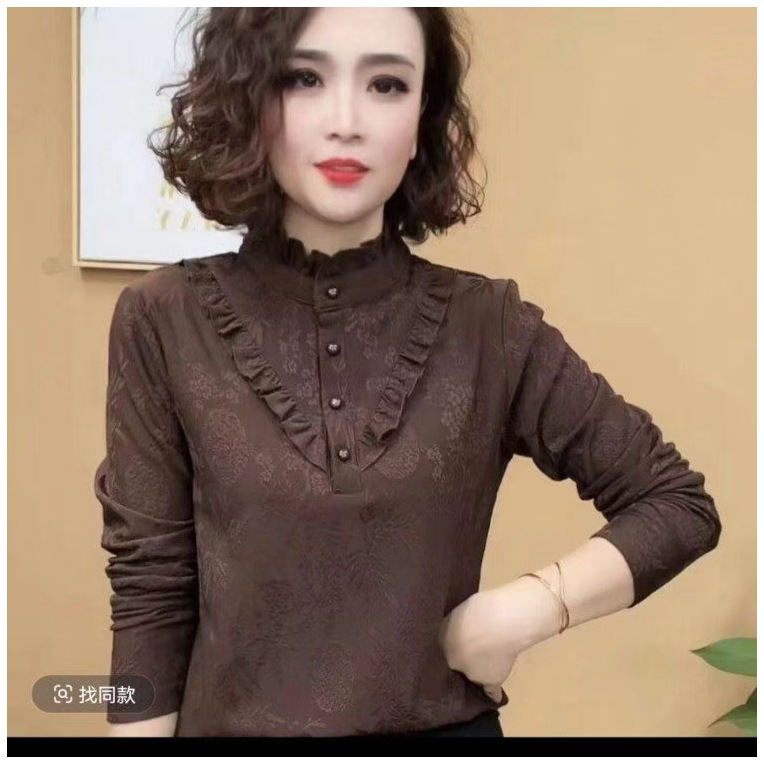 ディザトーンの爆発金2024秋冬の新しいファッションのレースの襟の暗い紋様のジャカードの洋風の立襟の長袖の中で底のシャツを掛けます。