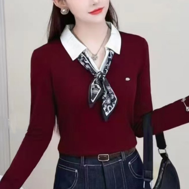 一件代发2025秋季新款时尚拼色翻领丝巾款长袖内搭原版打底衫上衣