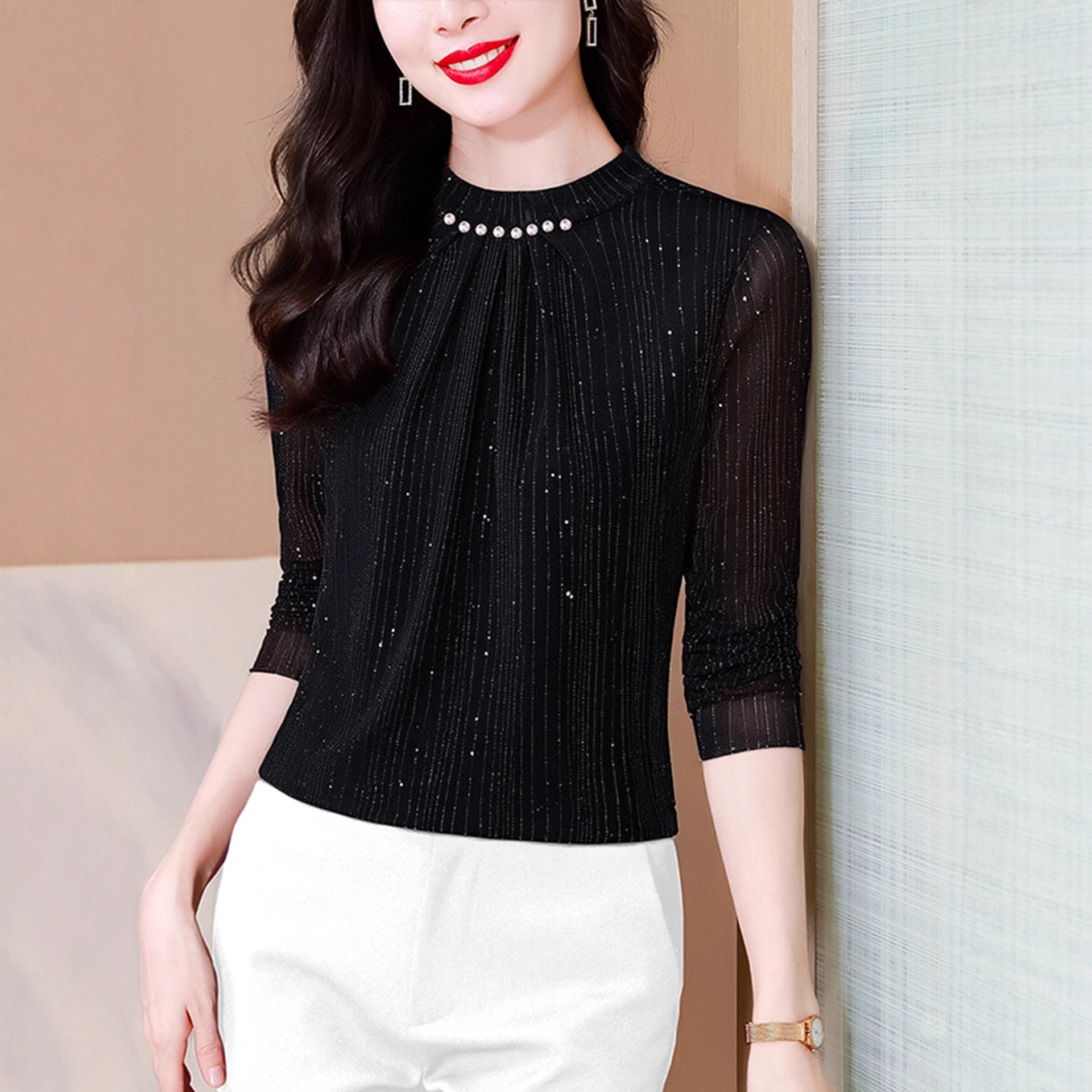 代発2025春の新型ファッション釘珠底シャツ長袖tシャツ女性シャツ弾力ネット上着