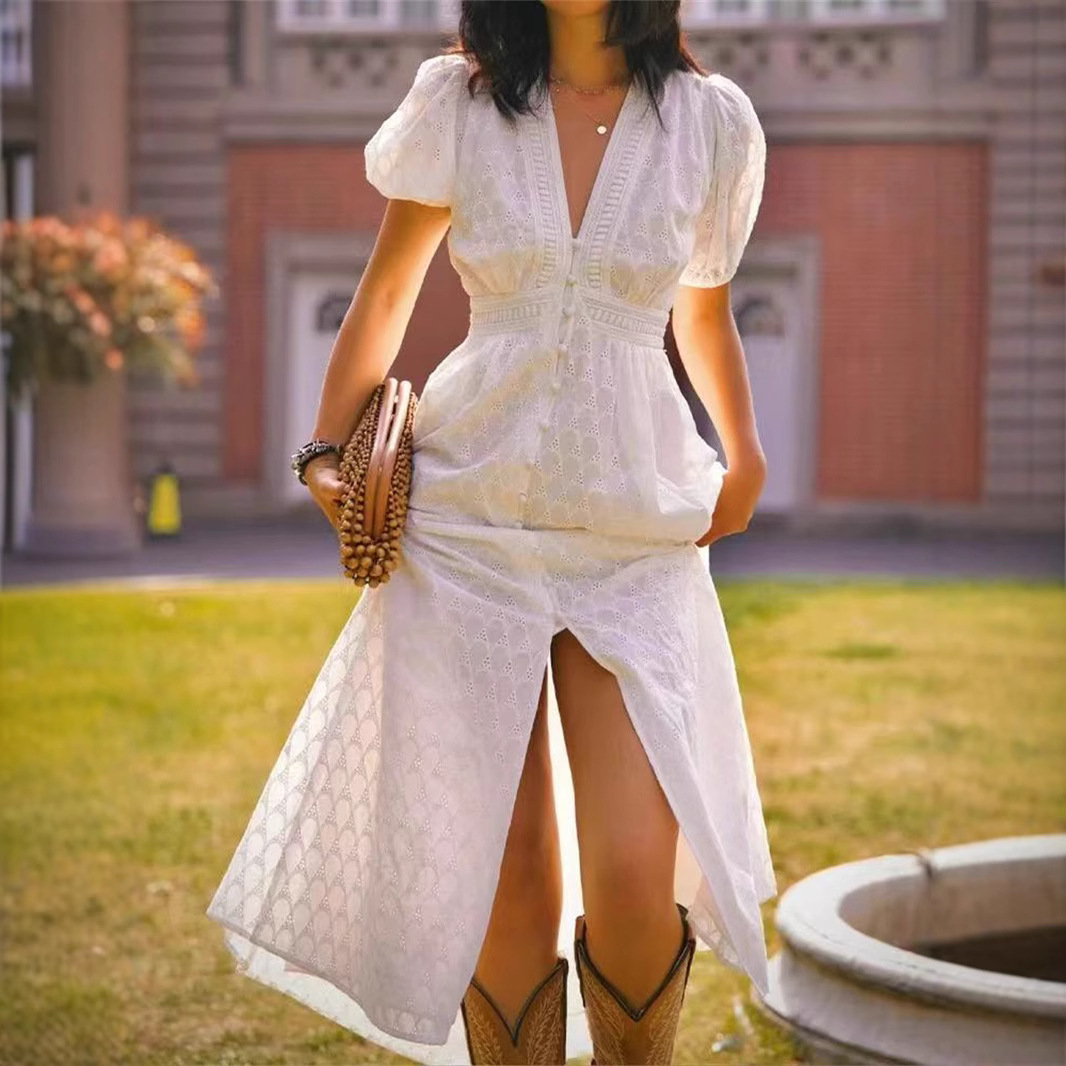 法式优雅24春夏新款橄榄绿玫瑰花语茶歇裙花苞袖连衣裙V领绑带裹身裙
