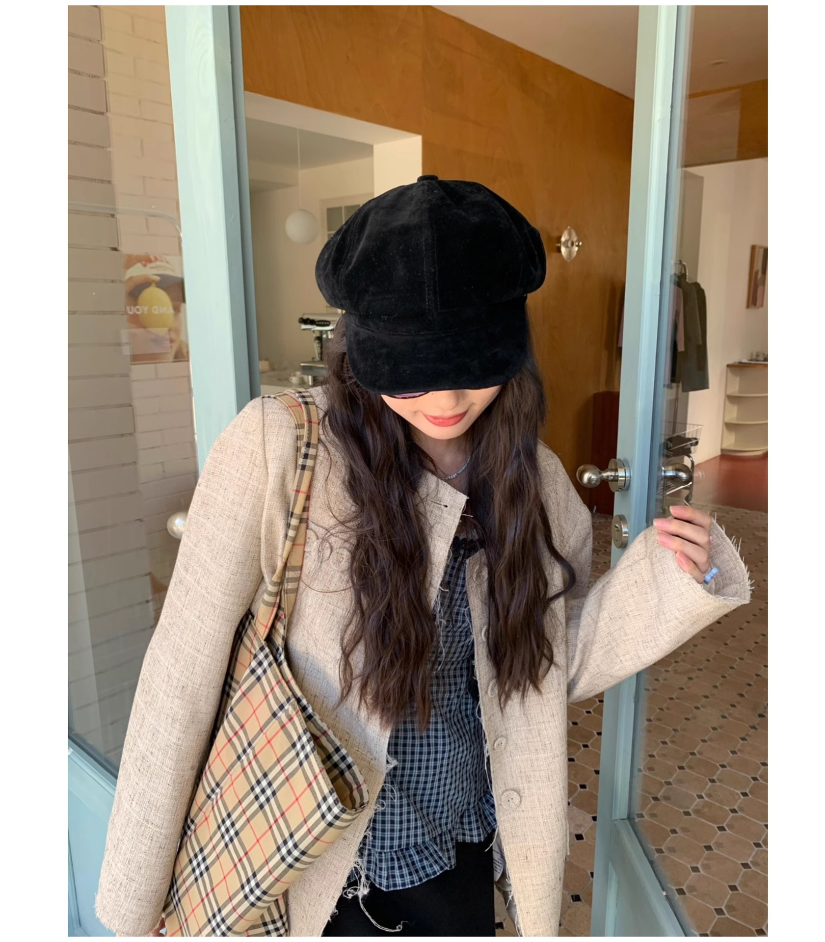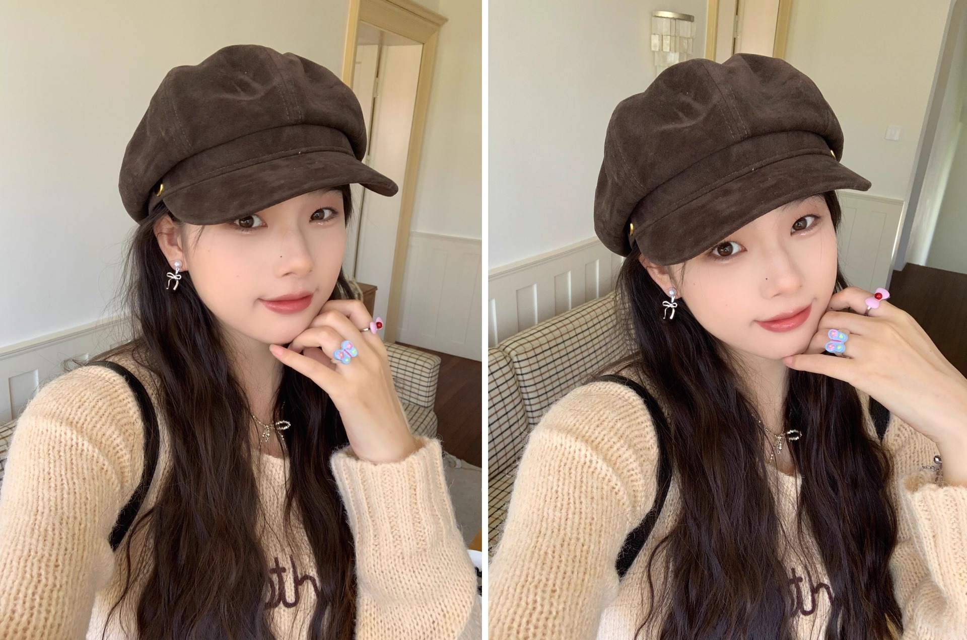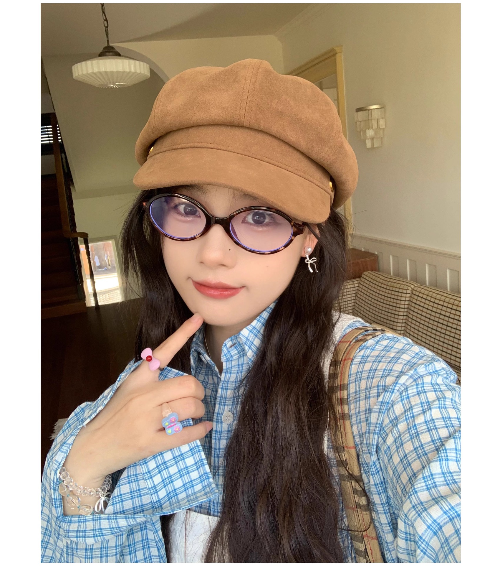 复古麂皮绒褶皱平顶鸭舌帽女大头围显脸小百搭新款报童帽出游通勤