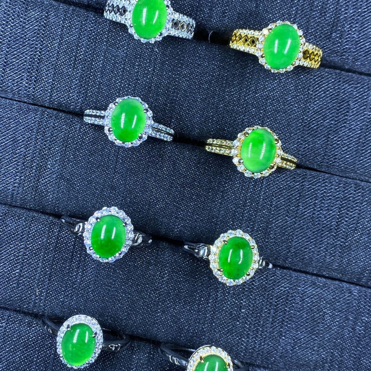 ミャンマー産天然A級翡翠入り925純銀製ハイアイスグリーンオーバル型リング、絶妙でファッショナブルなデザイン