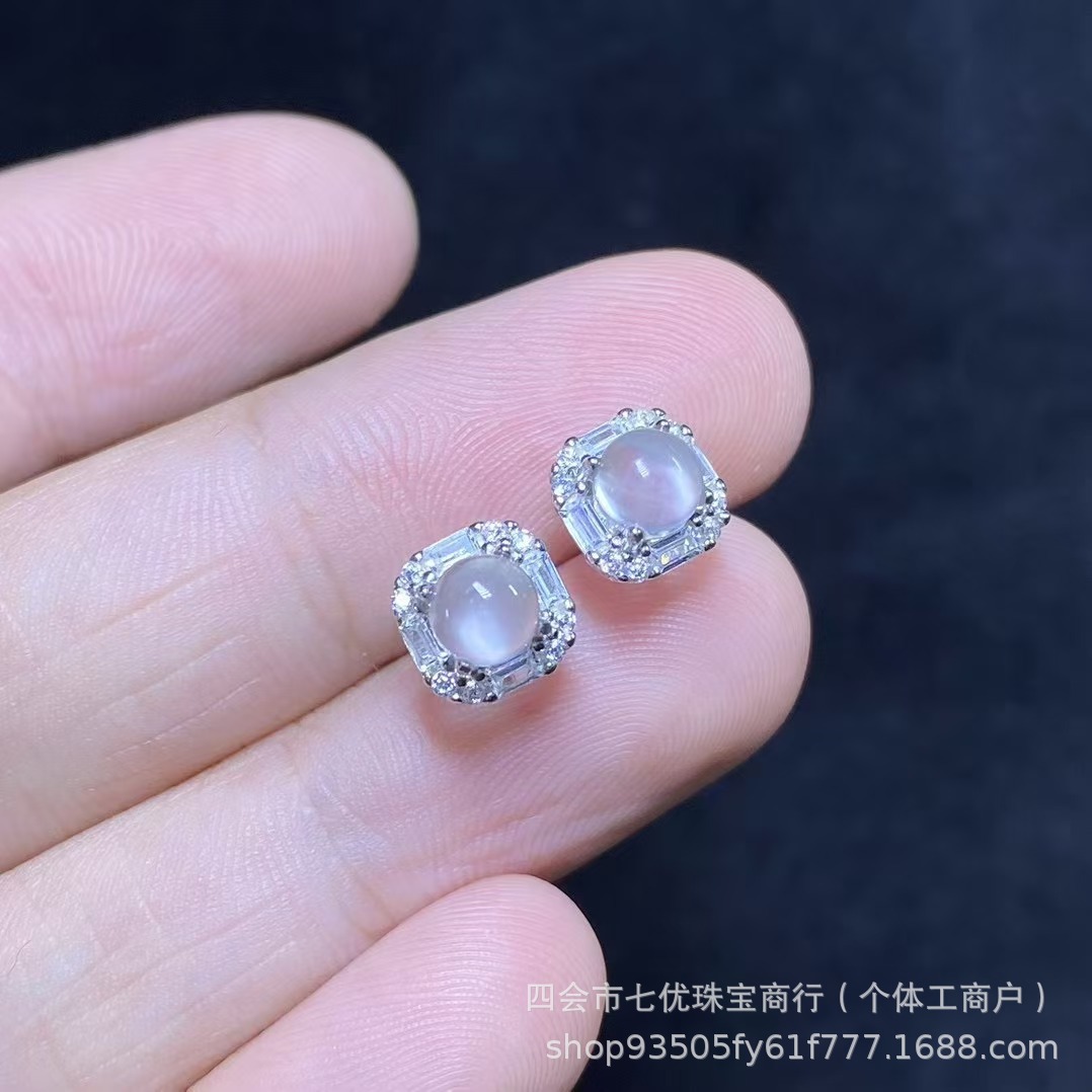 天然翡翠水泡玉ロシア材料起爆金s925純銀陽緑四方耳釘翡翠玉卵面銀モザイク