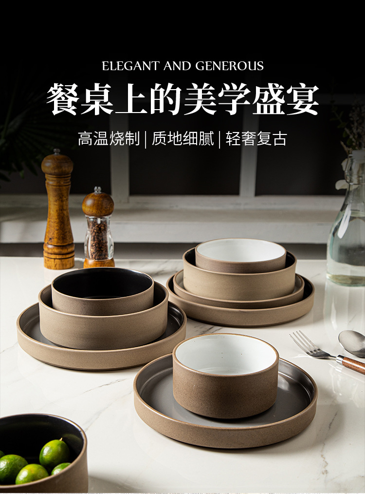 粗陶食器トレー料理皿レトロ餃子皿日本式陶磁器碗皿セット家庭用茶碗スープ碗