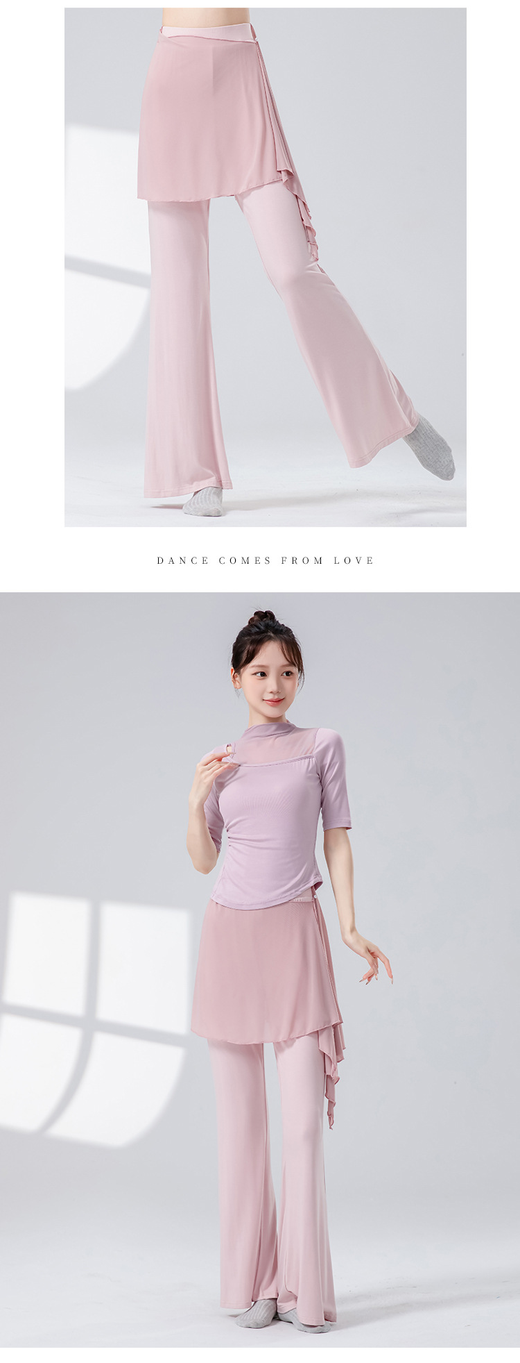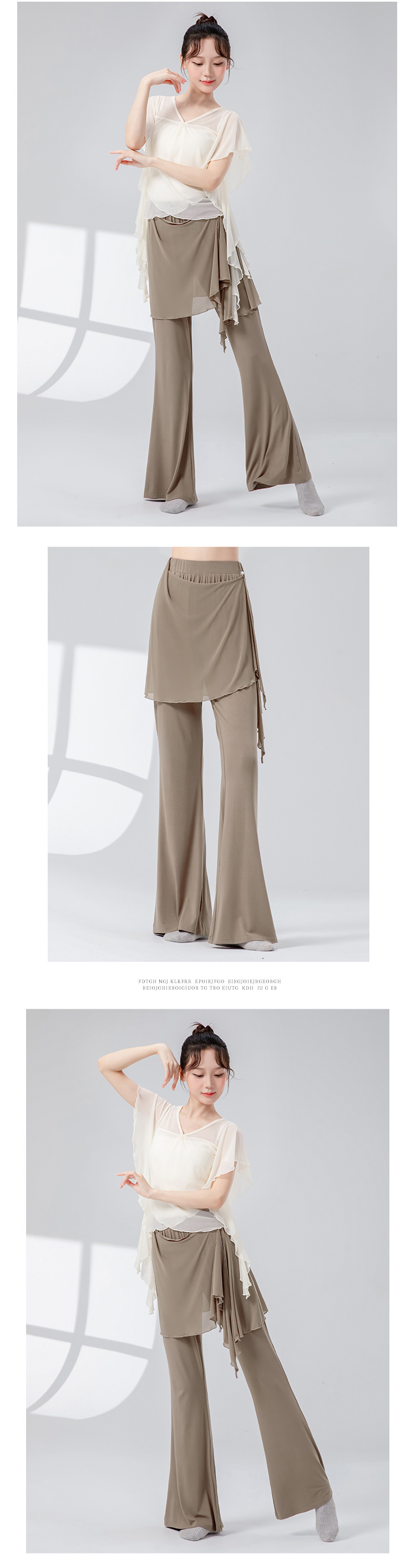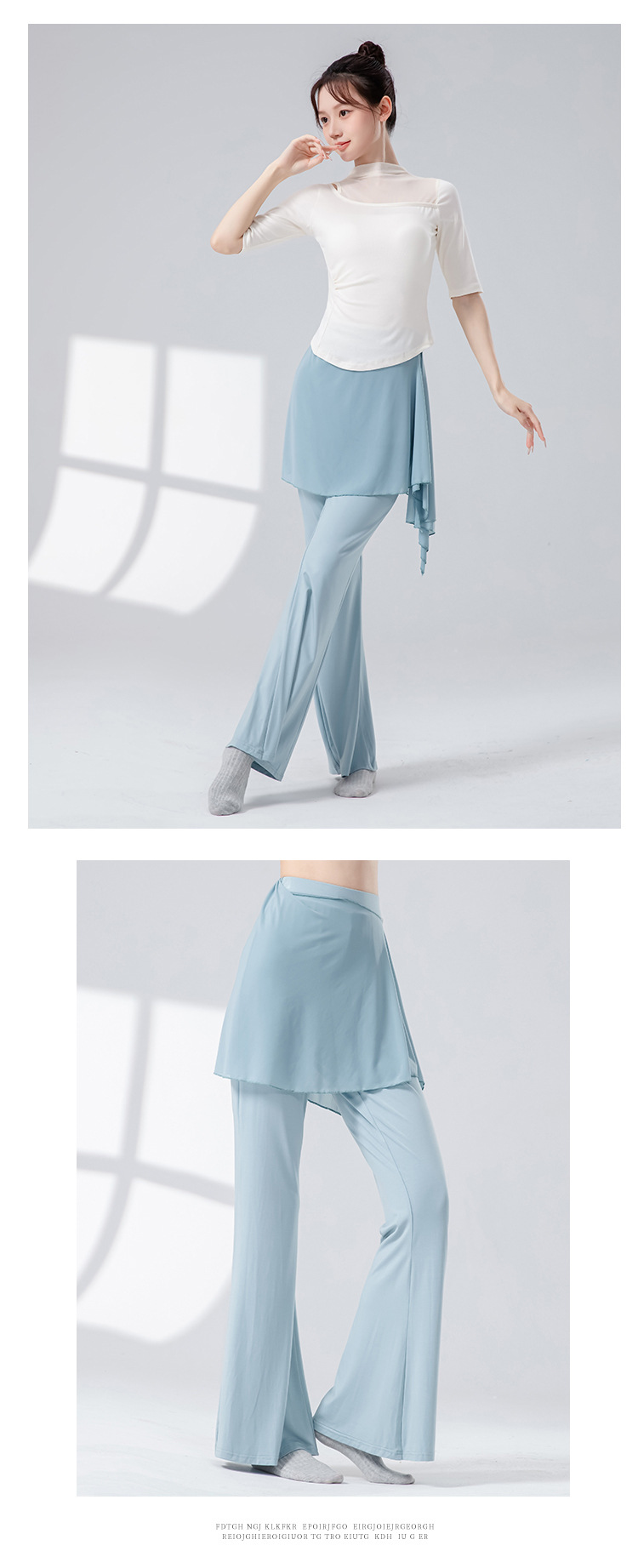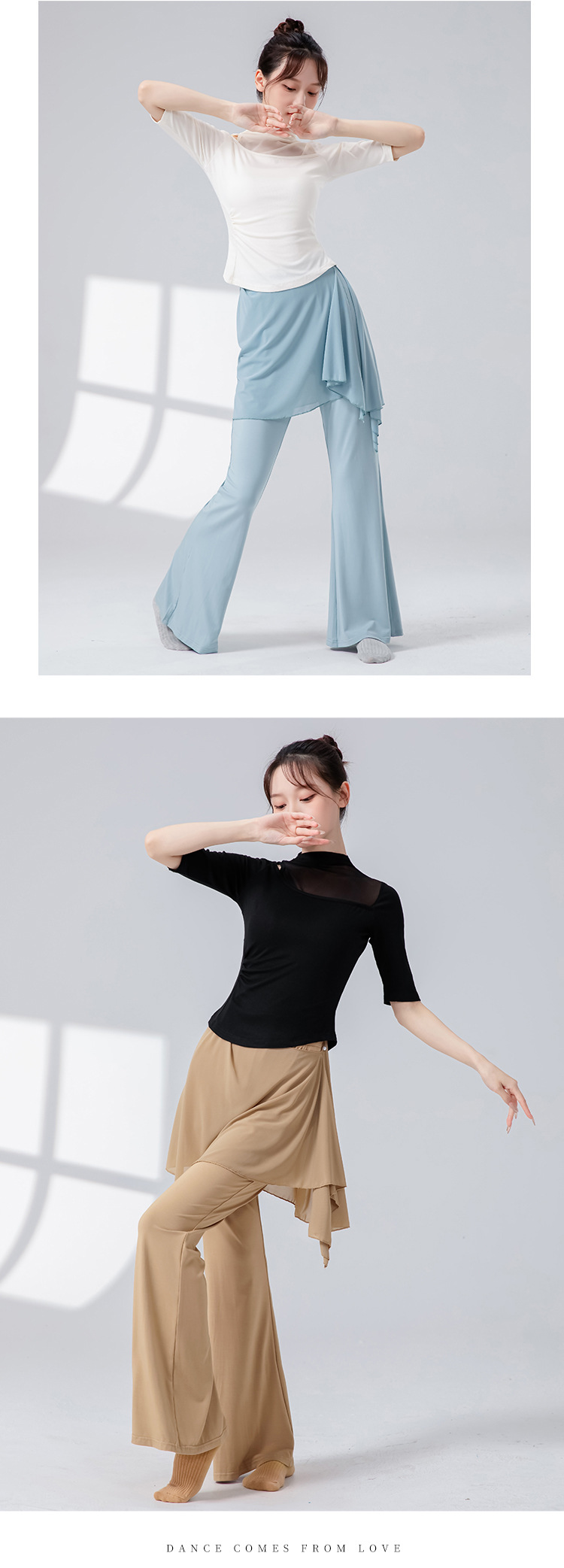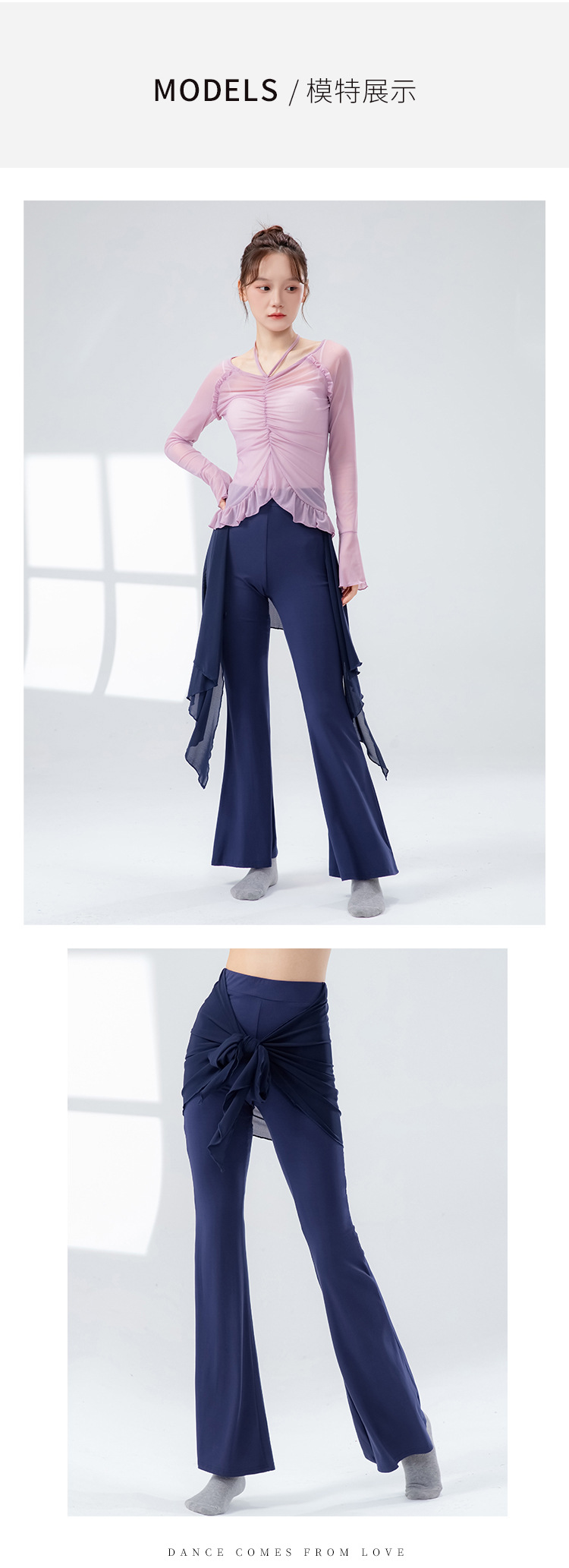 女性用モダンダンス練習服、ストレートウエストワイドパンツ、エレガントな中国舞踊リボン、古典舞踊試験ダンス服