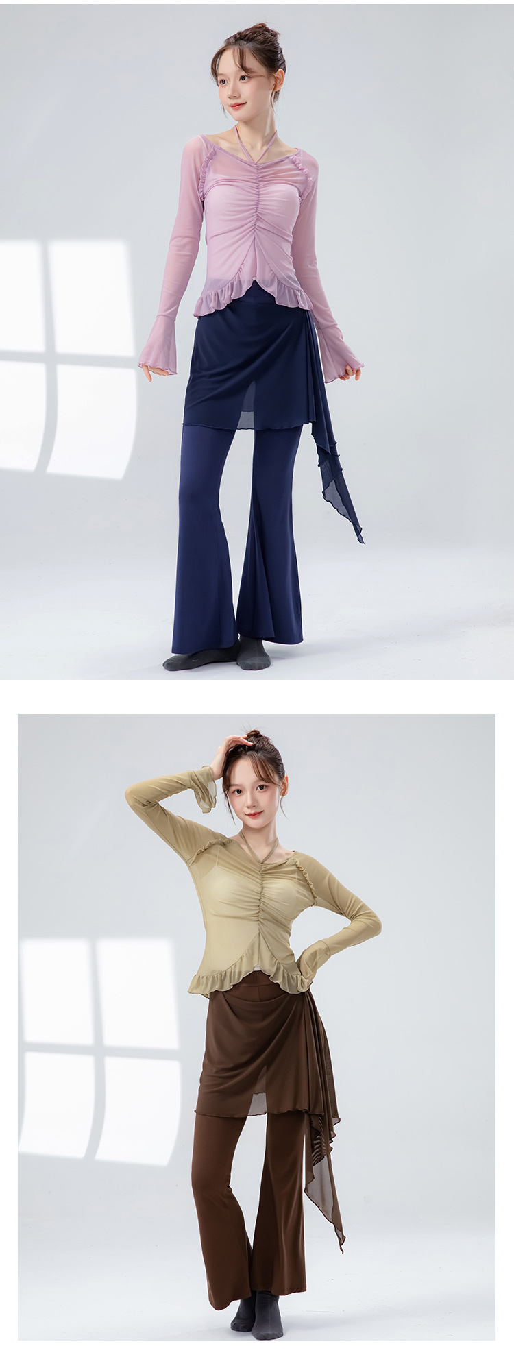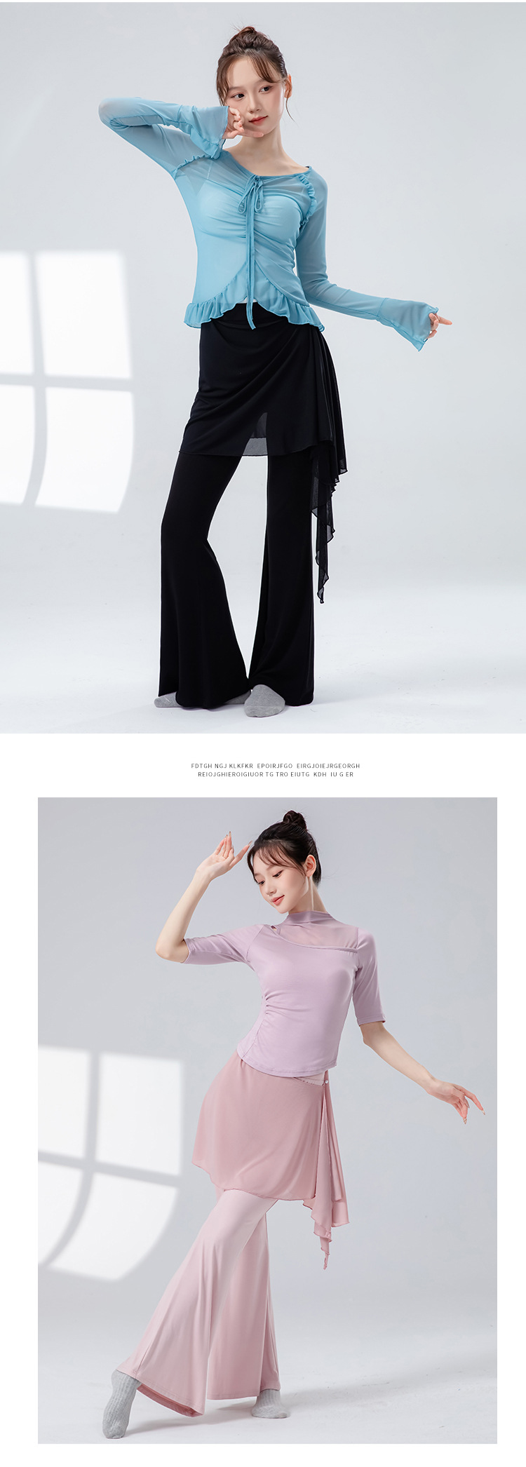 女性用クラシックダンス練習服、ヨガ、ピラティス、スリムフィット、ベルスリーブ、プリーツ長袖トップス、モダンダンス服、ガーゼ