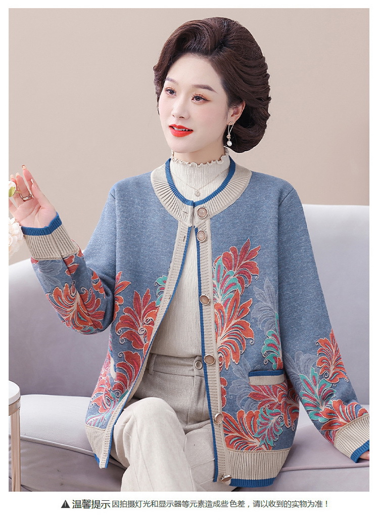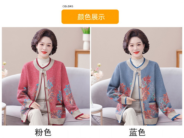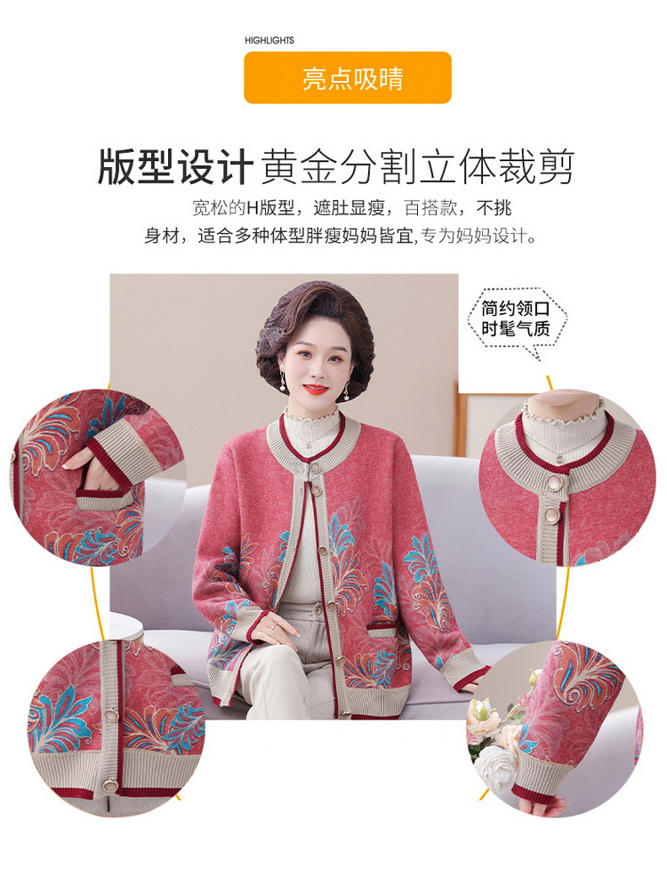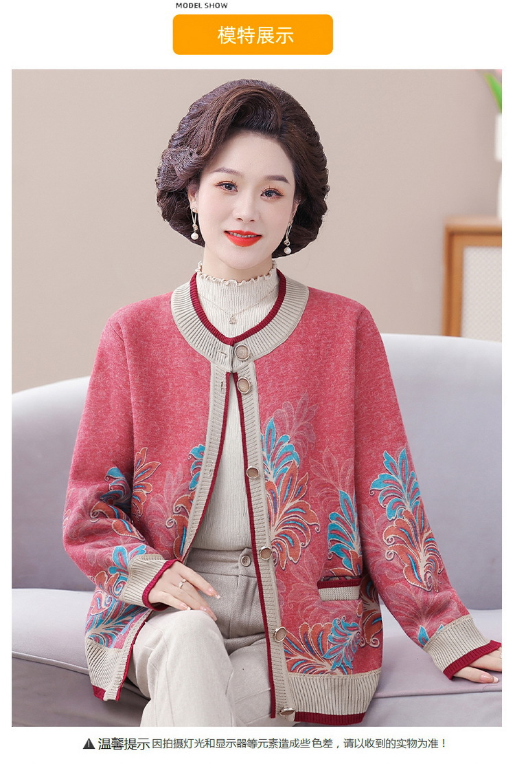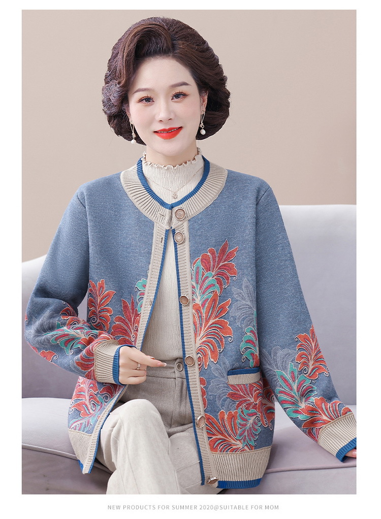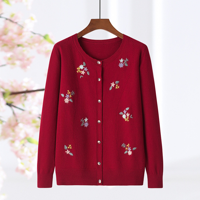 中年のお母さんは丸首の刺繍のカーディガンを詰めます。