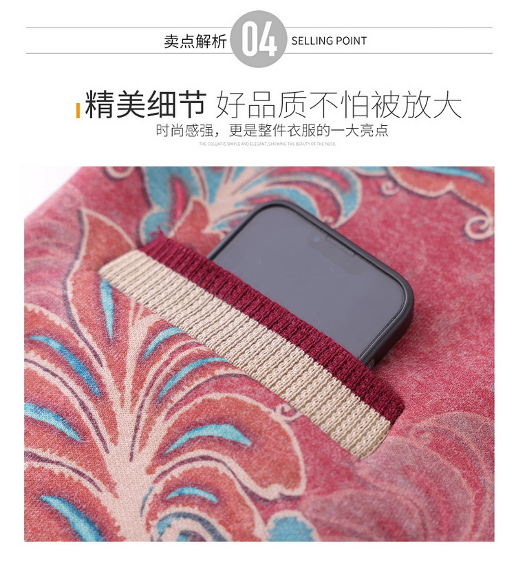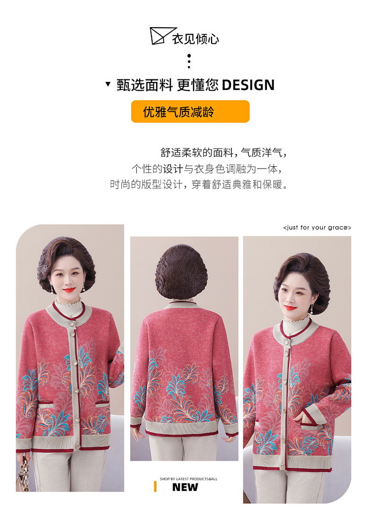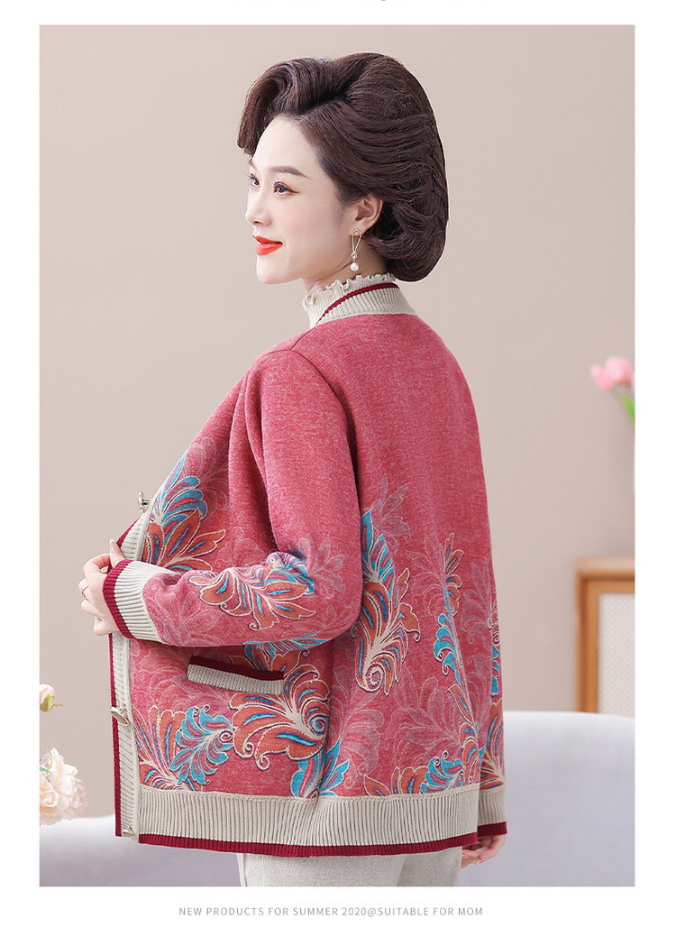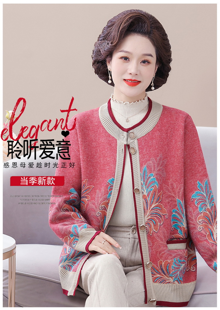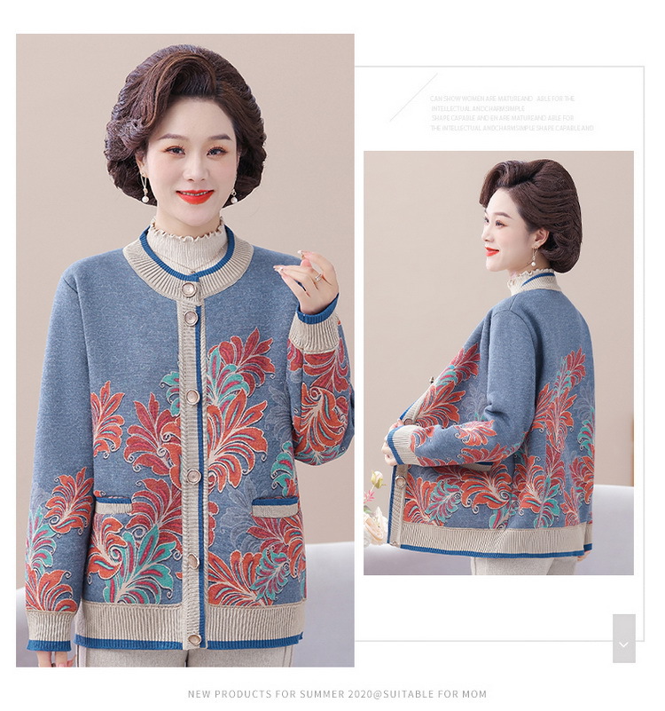 中年のお母さんは丸首の刺繍のカーディガンを詰めます。