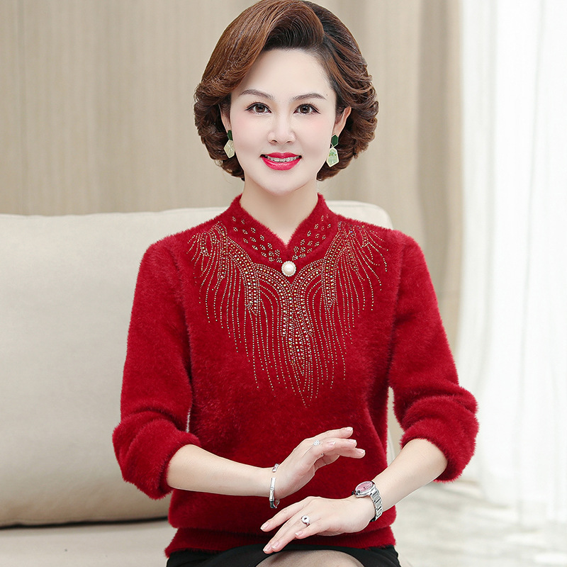 中高年のお母さんはチャイナドレスの襟を厚くしてミンクの毛のセーターの中年の婦人服のプルオーバーのファッションのゆったりしたニットの上着に似せます。