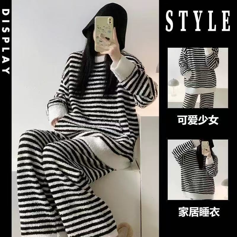 直播爆款睡衣女秋冬长毛绒圆领圆领条纹长袖韩版甜美家居服套装