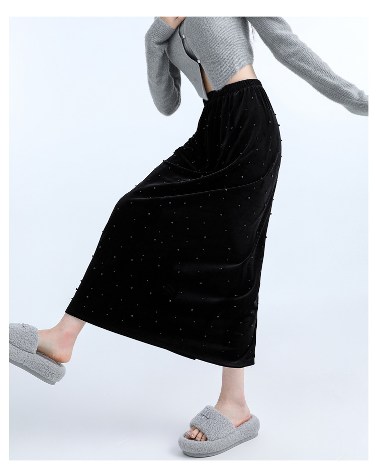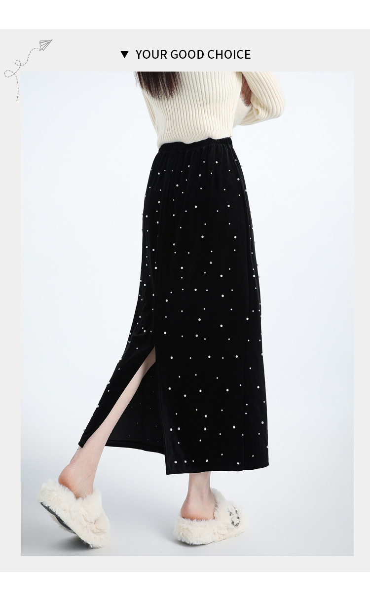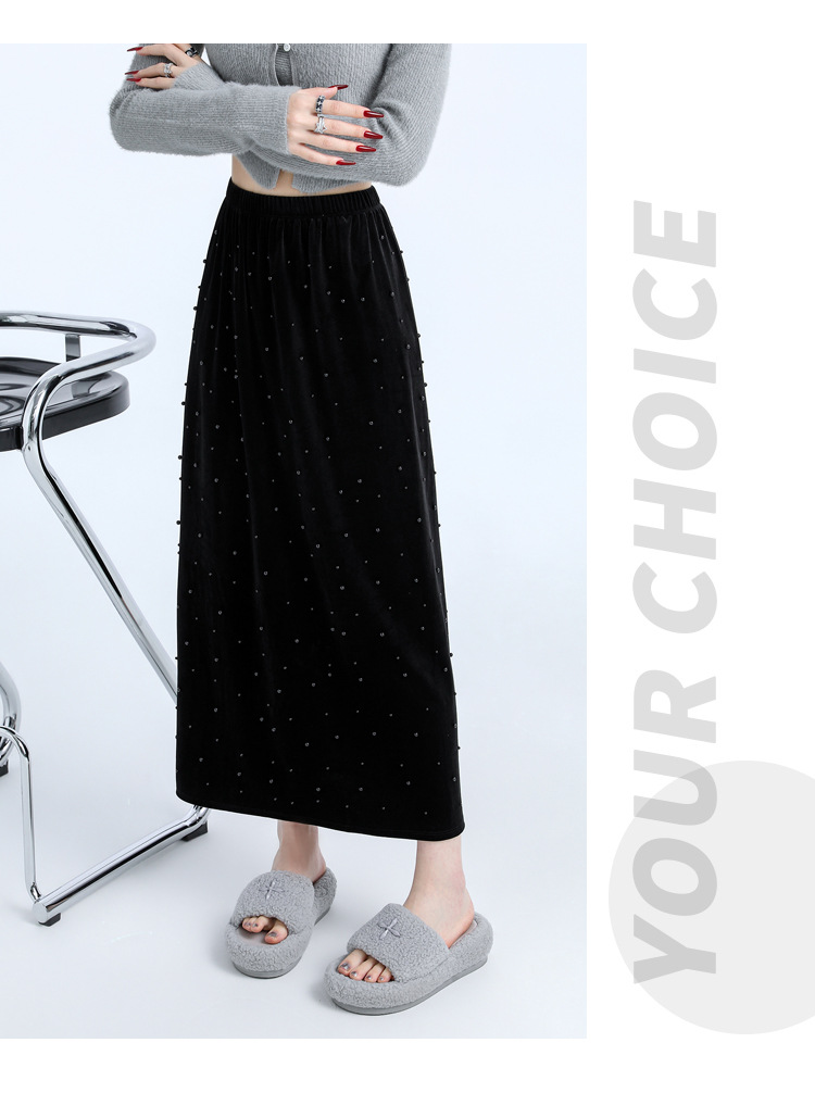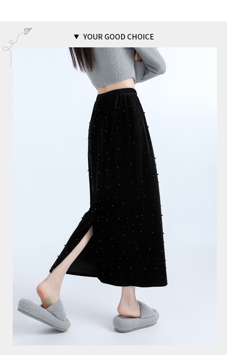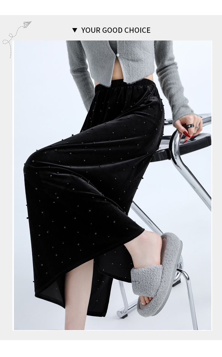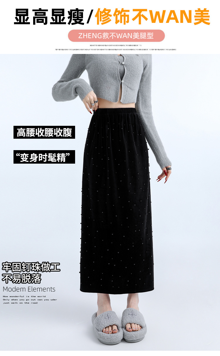 ホッチキスの金のベルベットのスカートの女性2024秋冬の新しい高腰ストレートの後ろにフォークa字のお尻のロングスカート