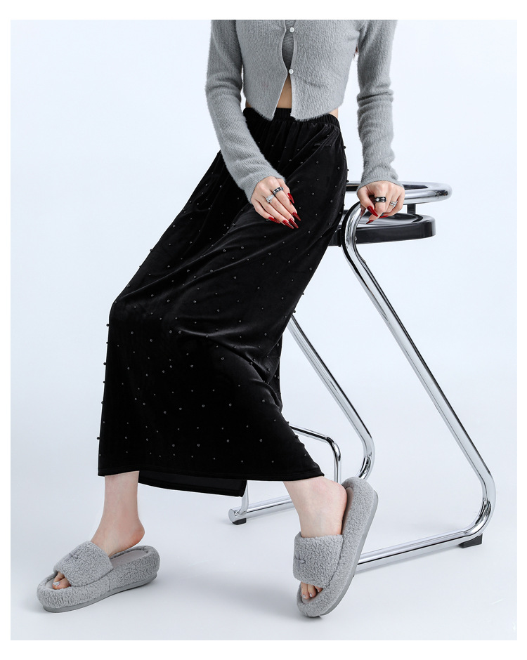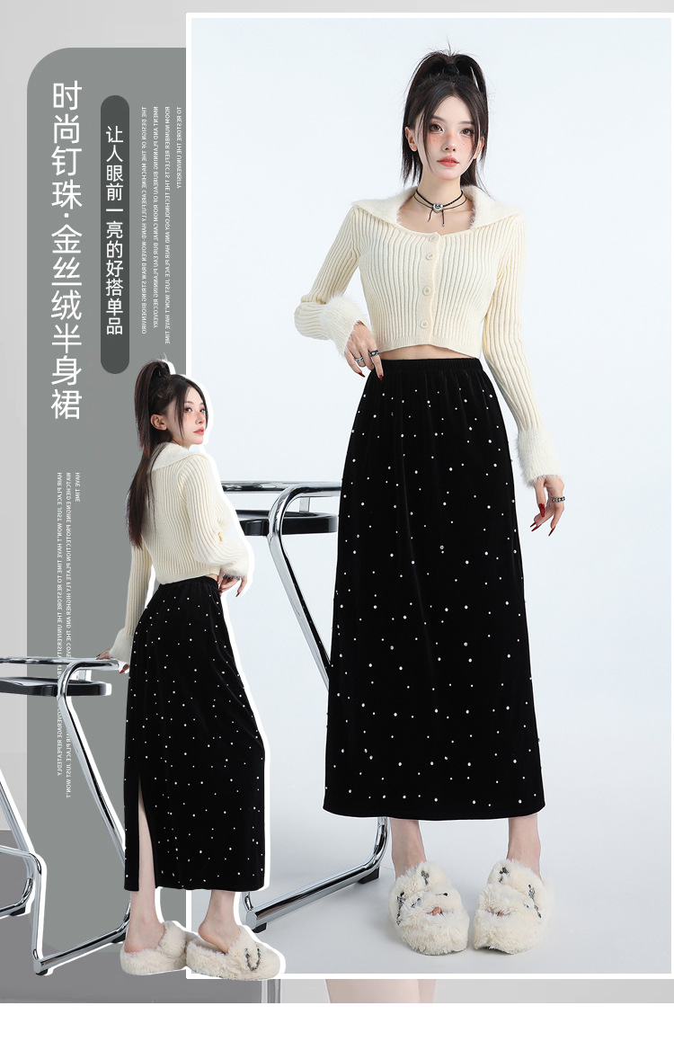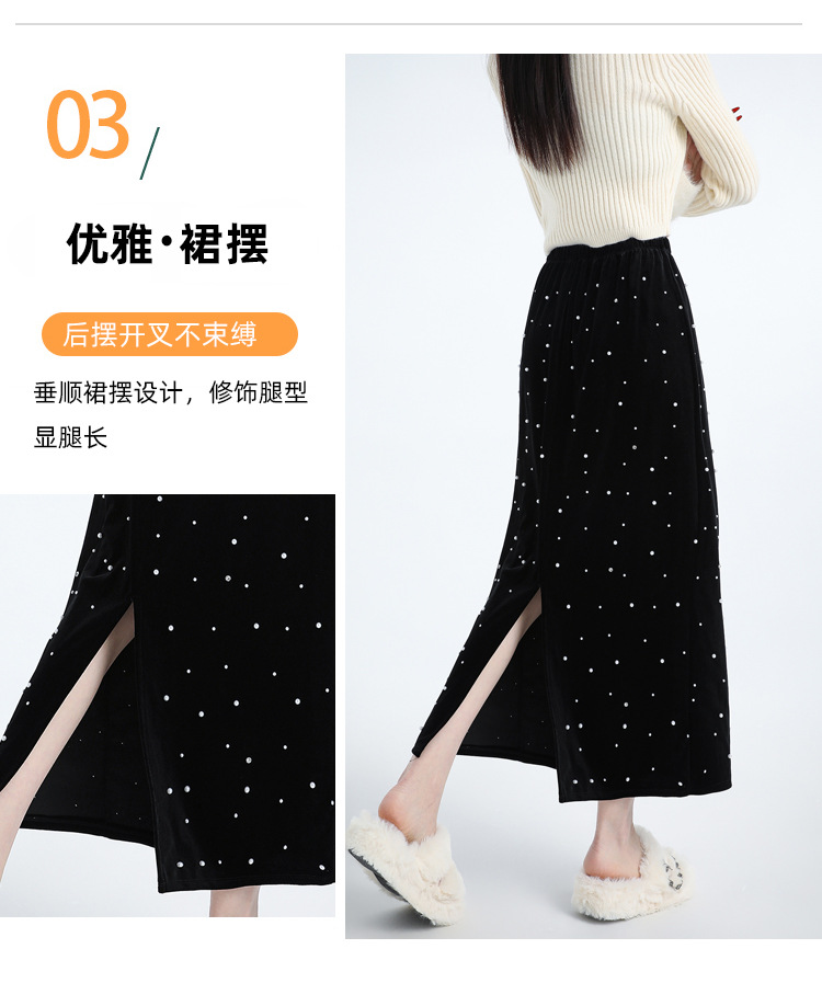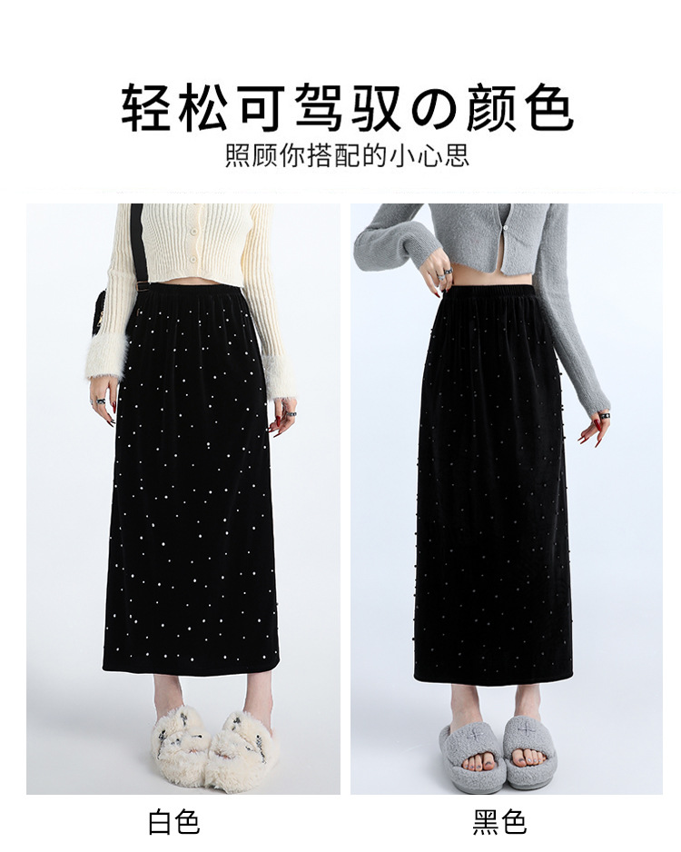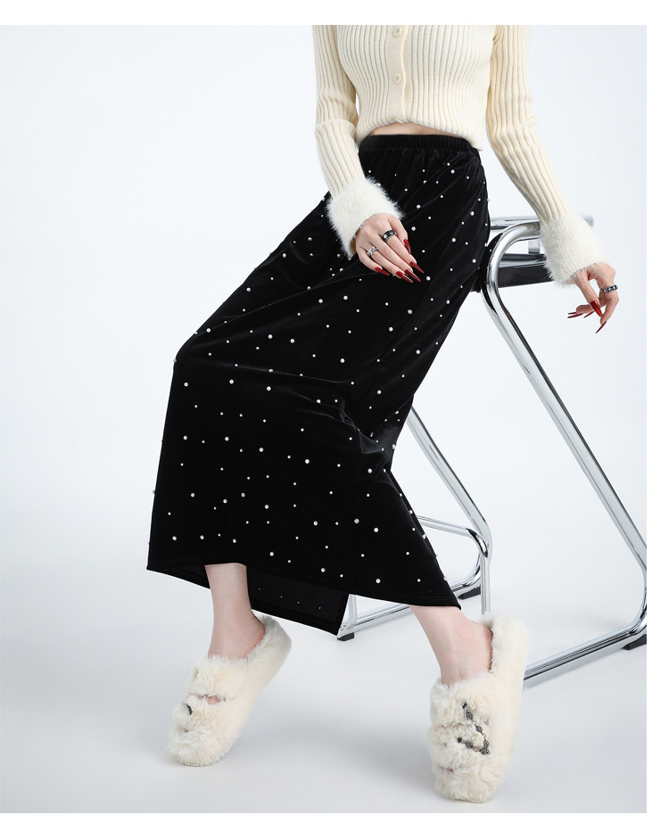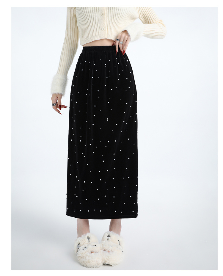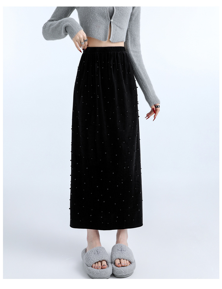 ホッチキスの金のベルベットのスカートの女性2024秋冬の新しい高腰ストレートの後ろにフォークa字のお尻のロングスカート