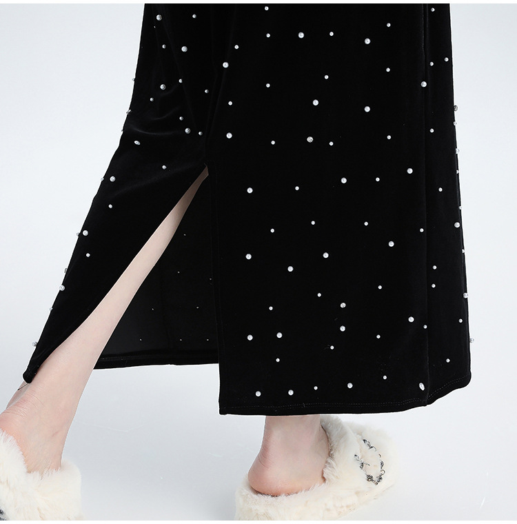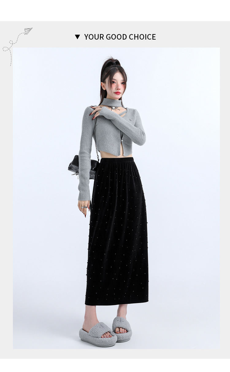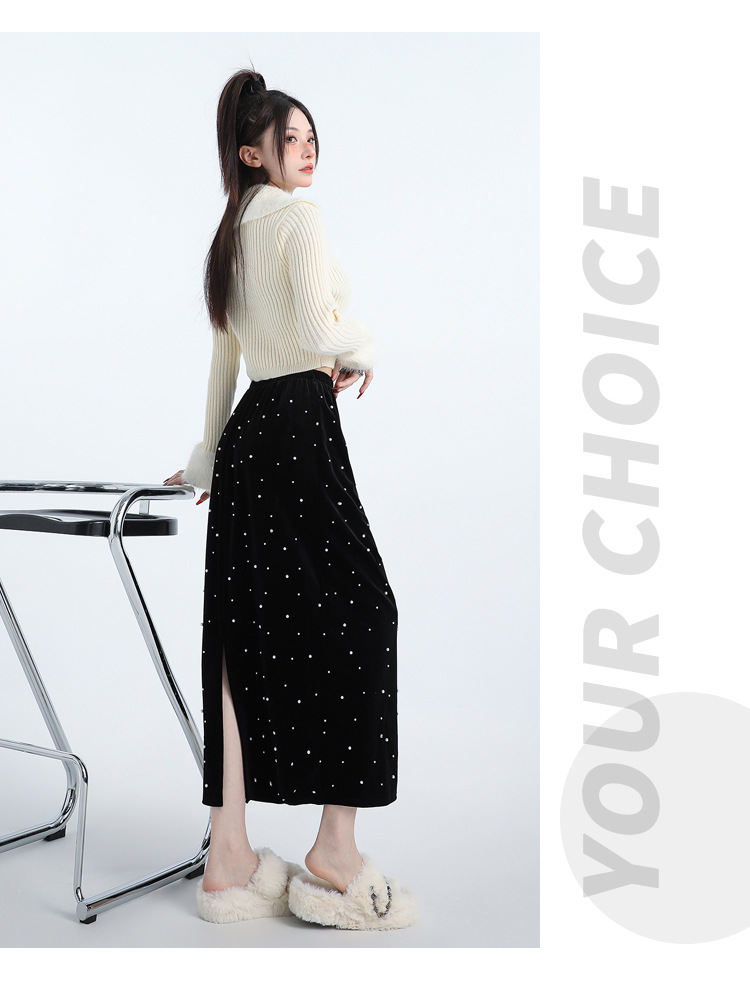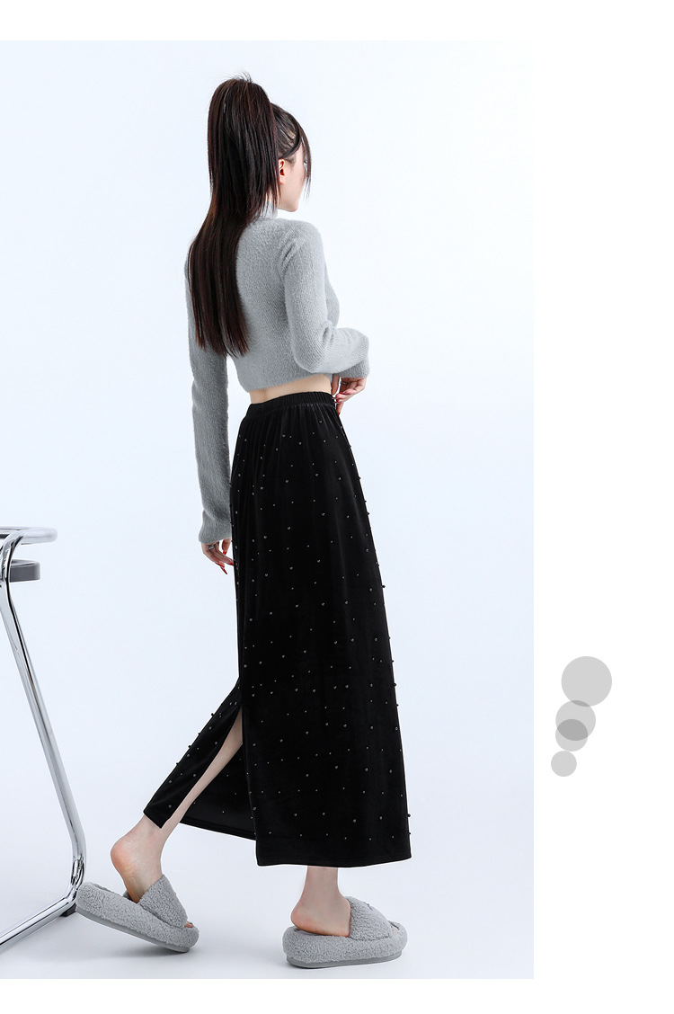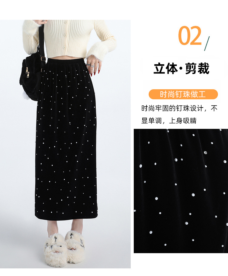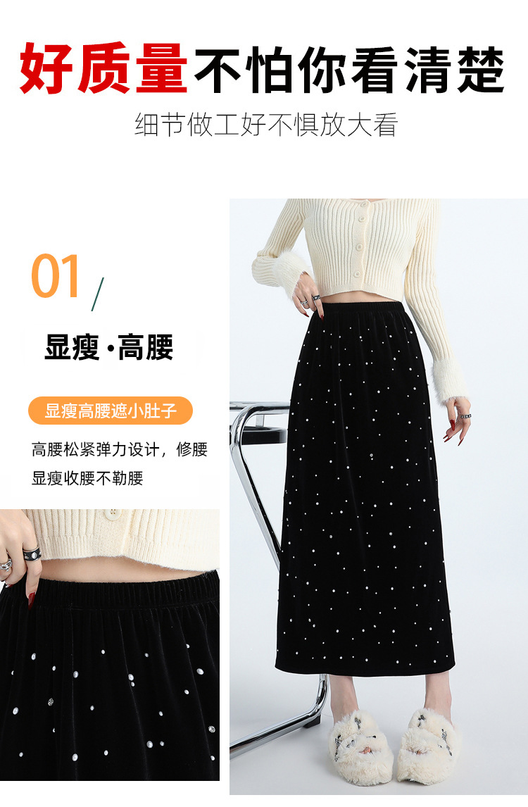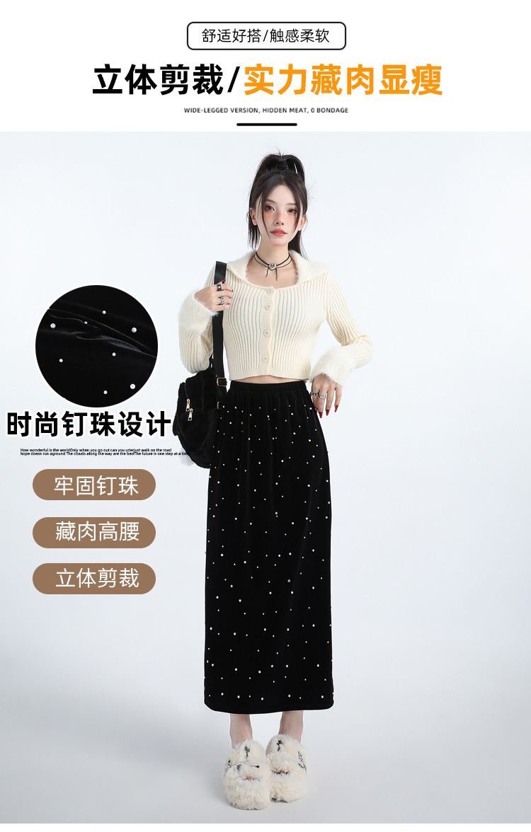 ホッチキスの金のベルベットのスカートの女性2024秋冬の新しい高腰ストレートの後ろにフォークa字のお尻のロングスカート