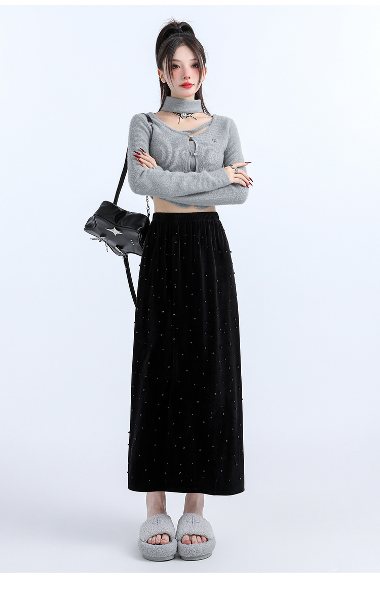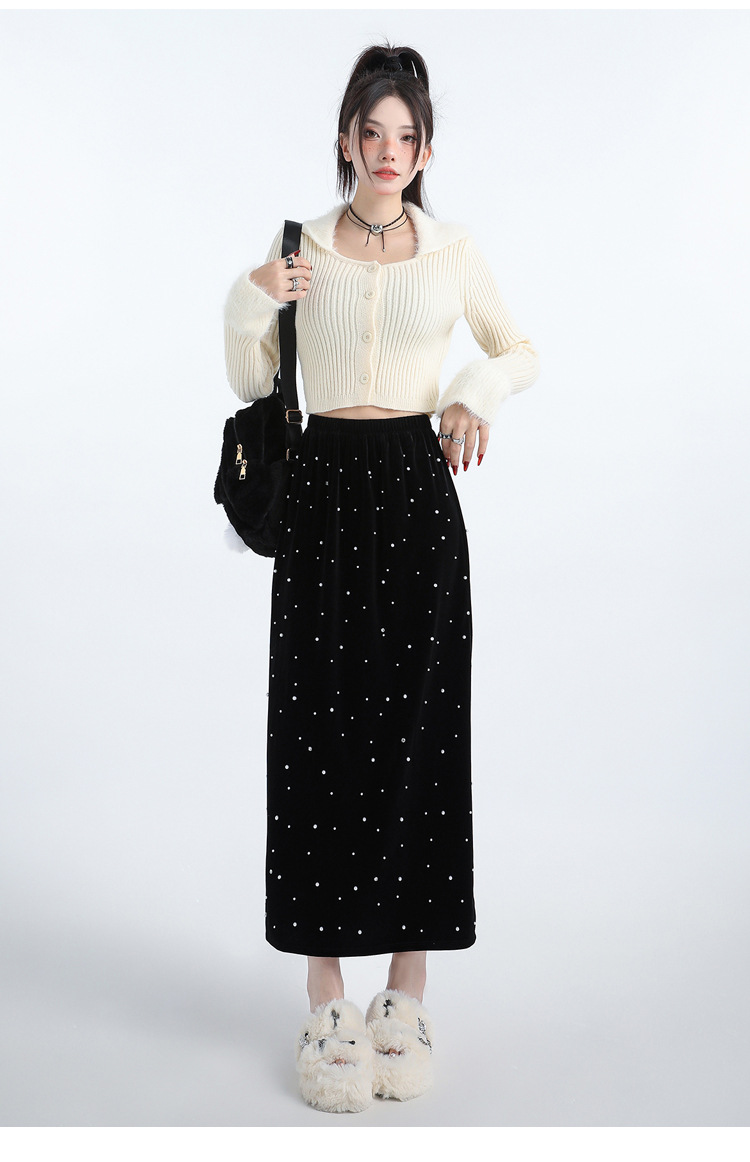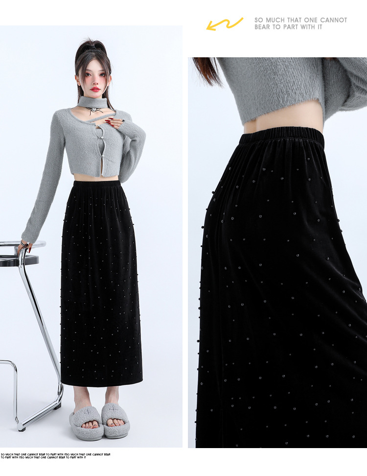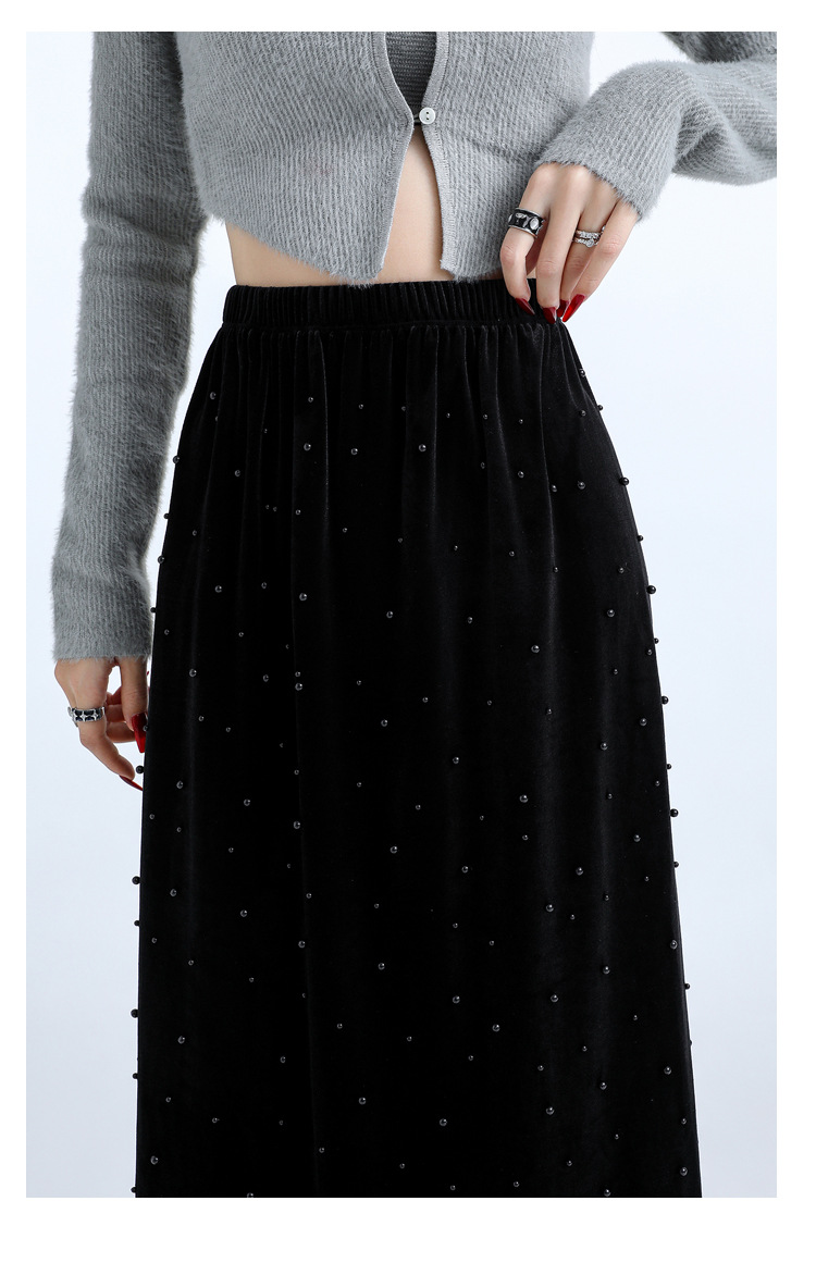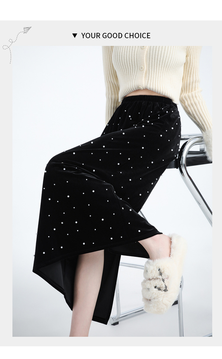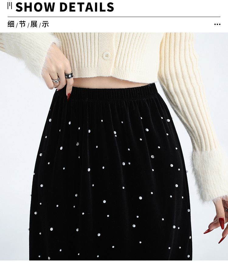 复古波点丝绒半身裙女秋冬贝壳装饰高级感气质百搭显瘦直筒长裙子