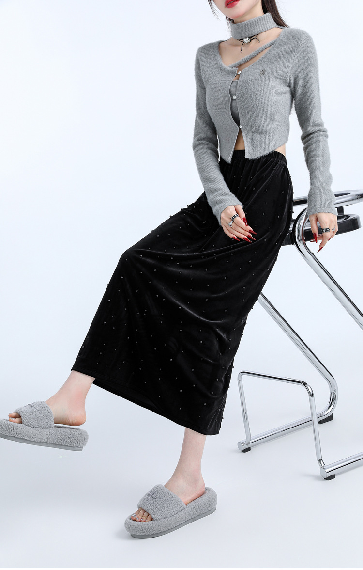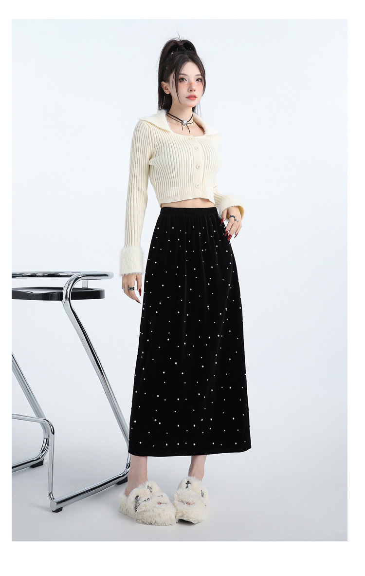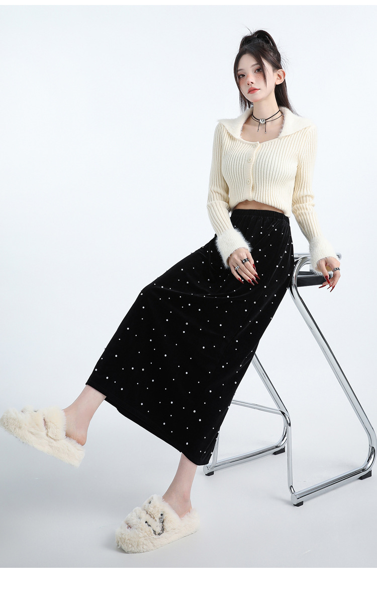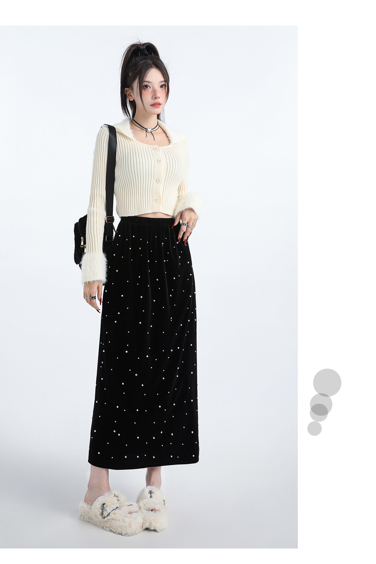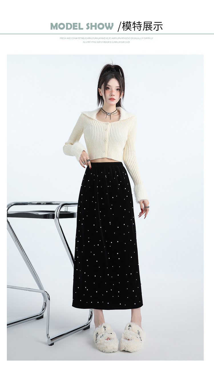 复古波点丝绒半身裙女秋冬贝壳装饰高级感气质百搭显瘦直筒长裙子