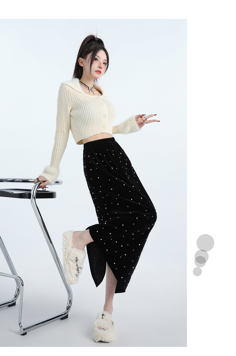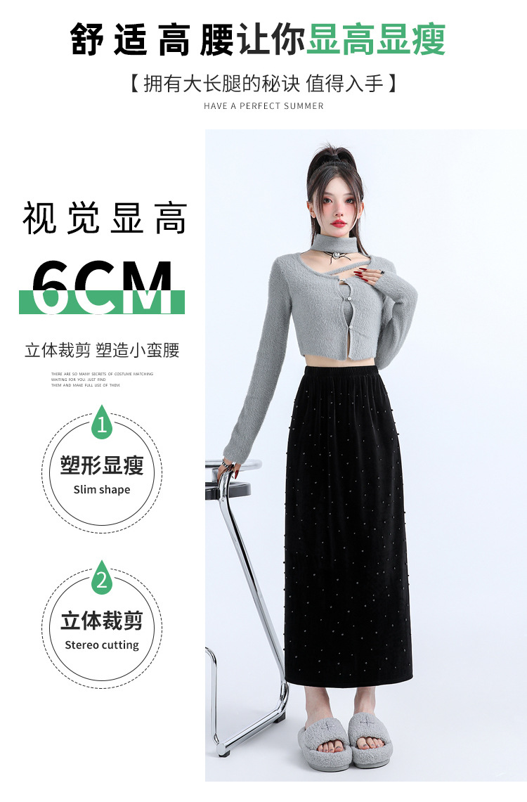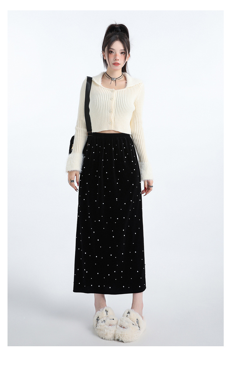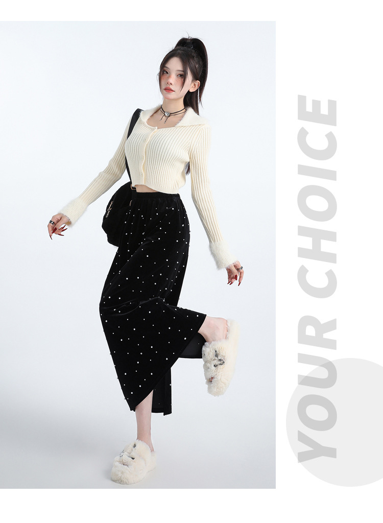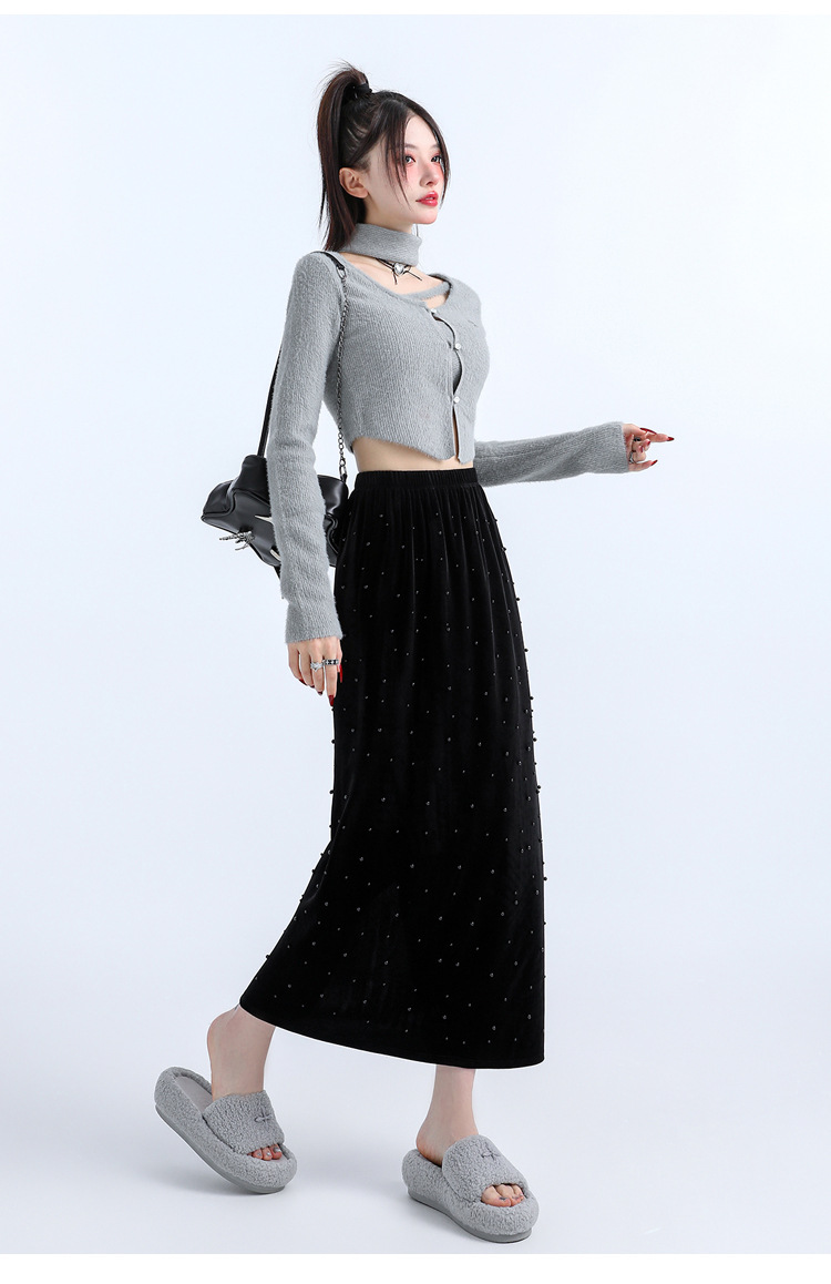 复古波点丝绒半身裙女秋冬贝壳装饰高级感气质百搭显瘦直筒长裙子