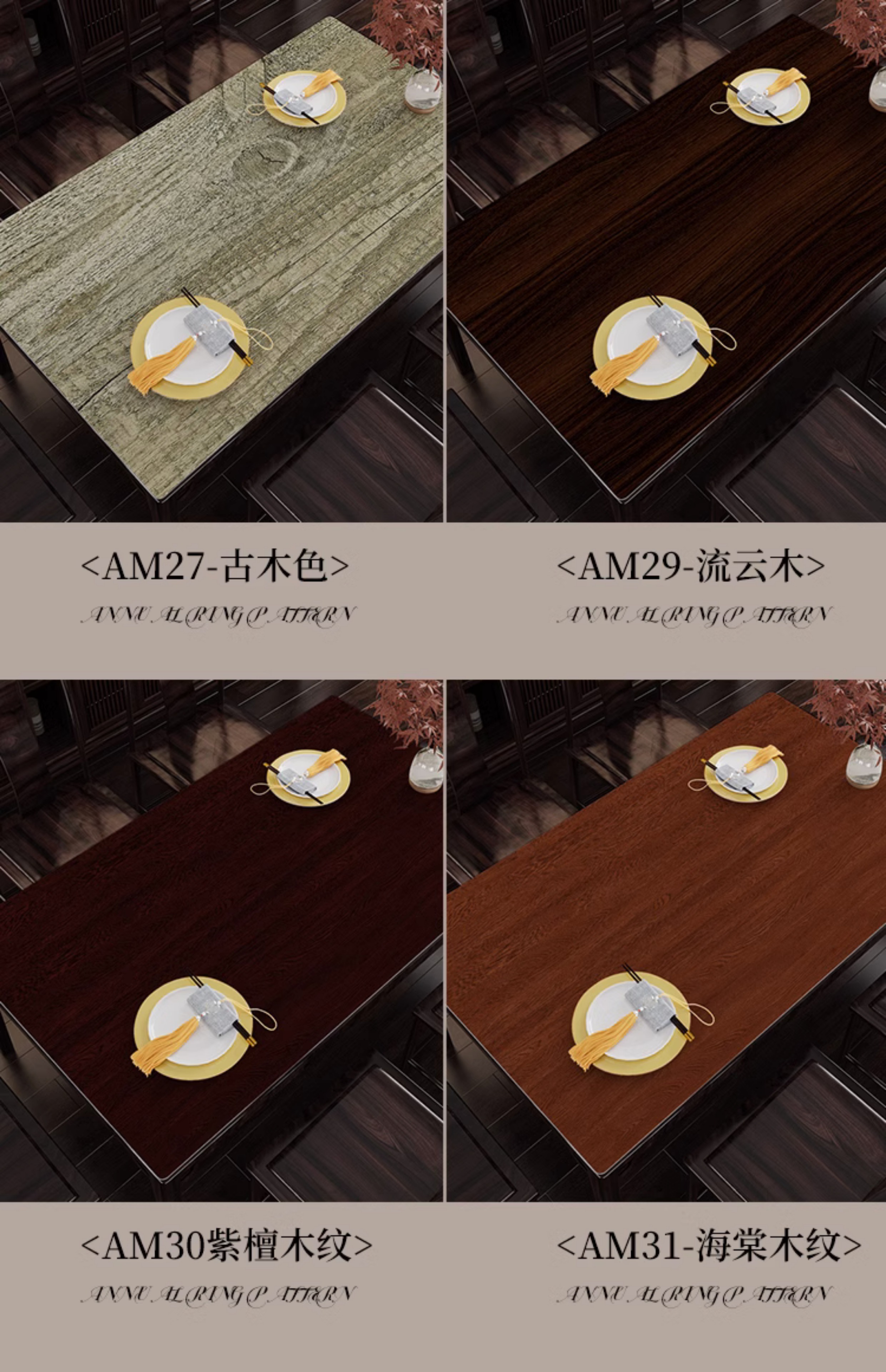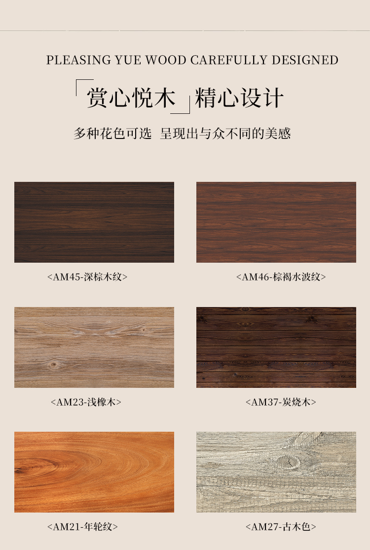 AM21年ホイールパターン,AM22-イエローオーク,AM24-ヴィンテージオーク,AM29-リウユンム,AM30 ローズウッドグレイン,AM31-ベゴニア木目,AM35-梨木目,AM36-ボルドーウォールナット,AM37-木炭焼き,AM40-ラバー木目,AM41-アカシア木目,AM45-ダークブラウン木目,AM46-タン水の波紋,AM57-北米産ウォールナット,AM58-南米産マホガニー,AM60-北欧ログ,AM61-アジアンウォールナット,AM62-チーク,AM63-ヒッコリー,AM64-ホワイトメープル