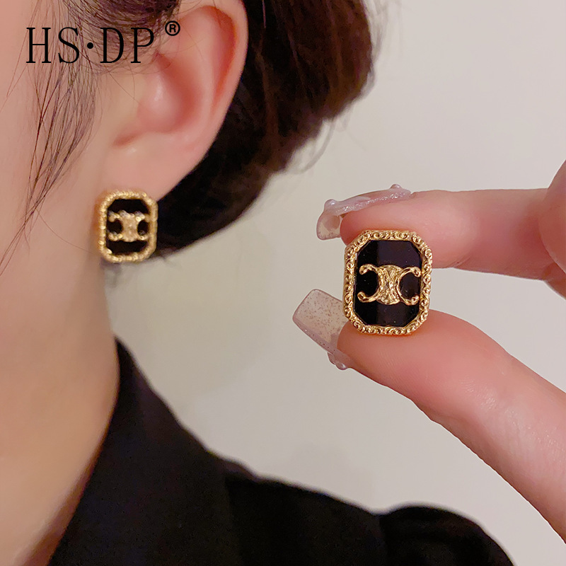 S925銀針レトロ気質小香風幾何学黒凱旋門ピアス軽豪華小衆デザインネット赤イヤリング