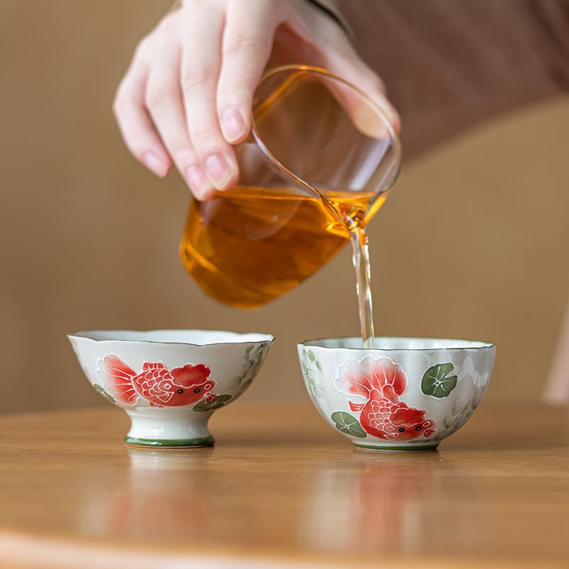 草の木の灰色の手描きの金魚の高足の杯の主人の杯の釉薬の下で彩ります。