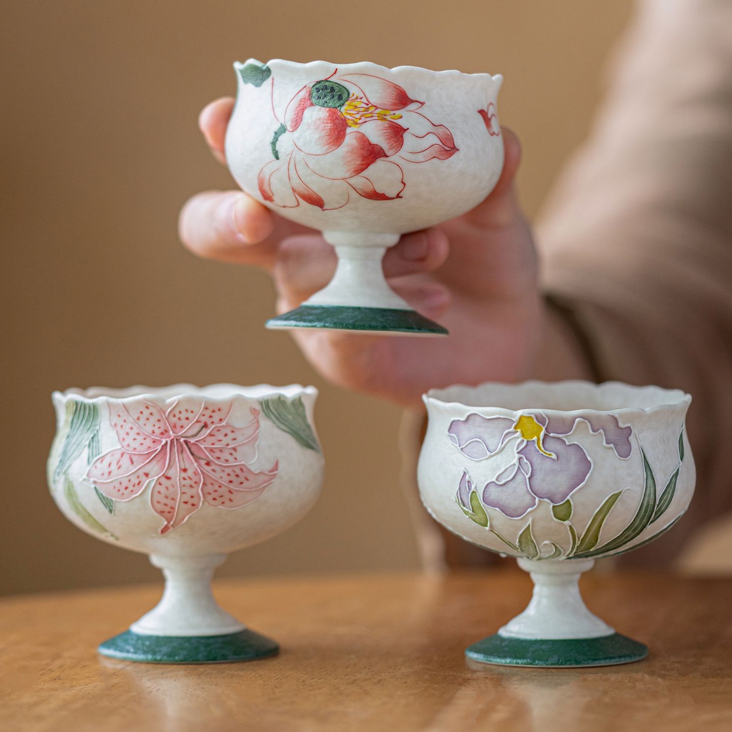 手绘荷花葵口高足杯陶瓷釉下彩茶杯茶室轻奢茶具主人杯品茗杯