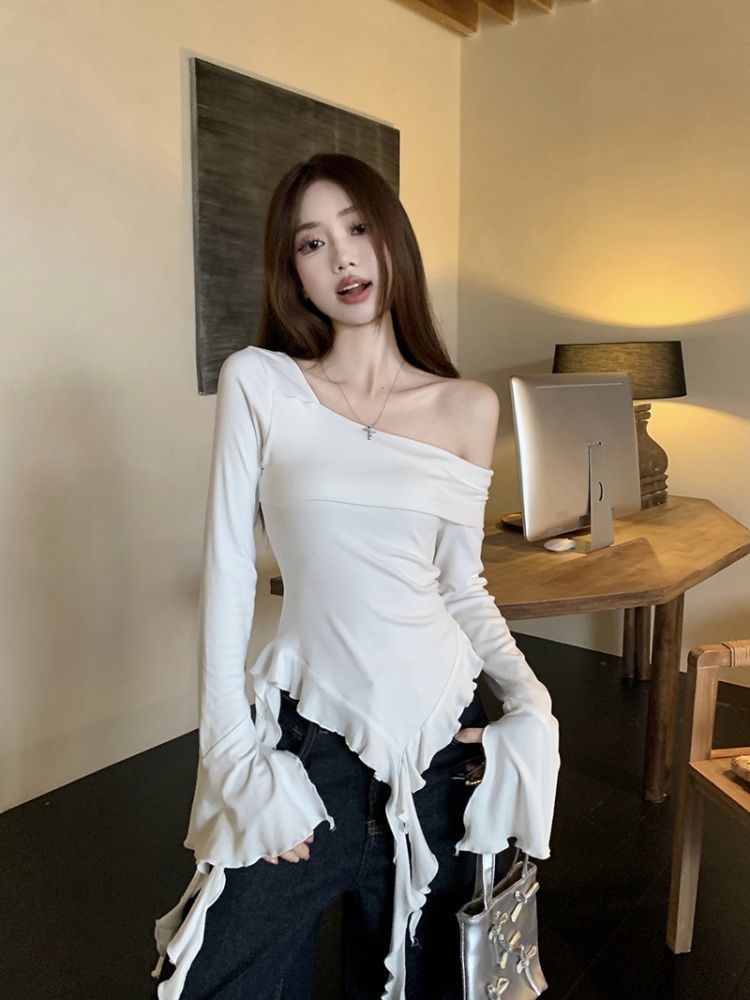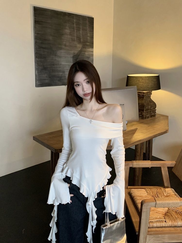 2024新型露肩一字襟偽長袖tシャツ早秋金修身痩せギャル小衆上着ins