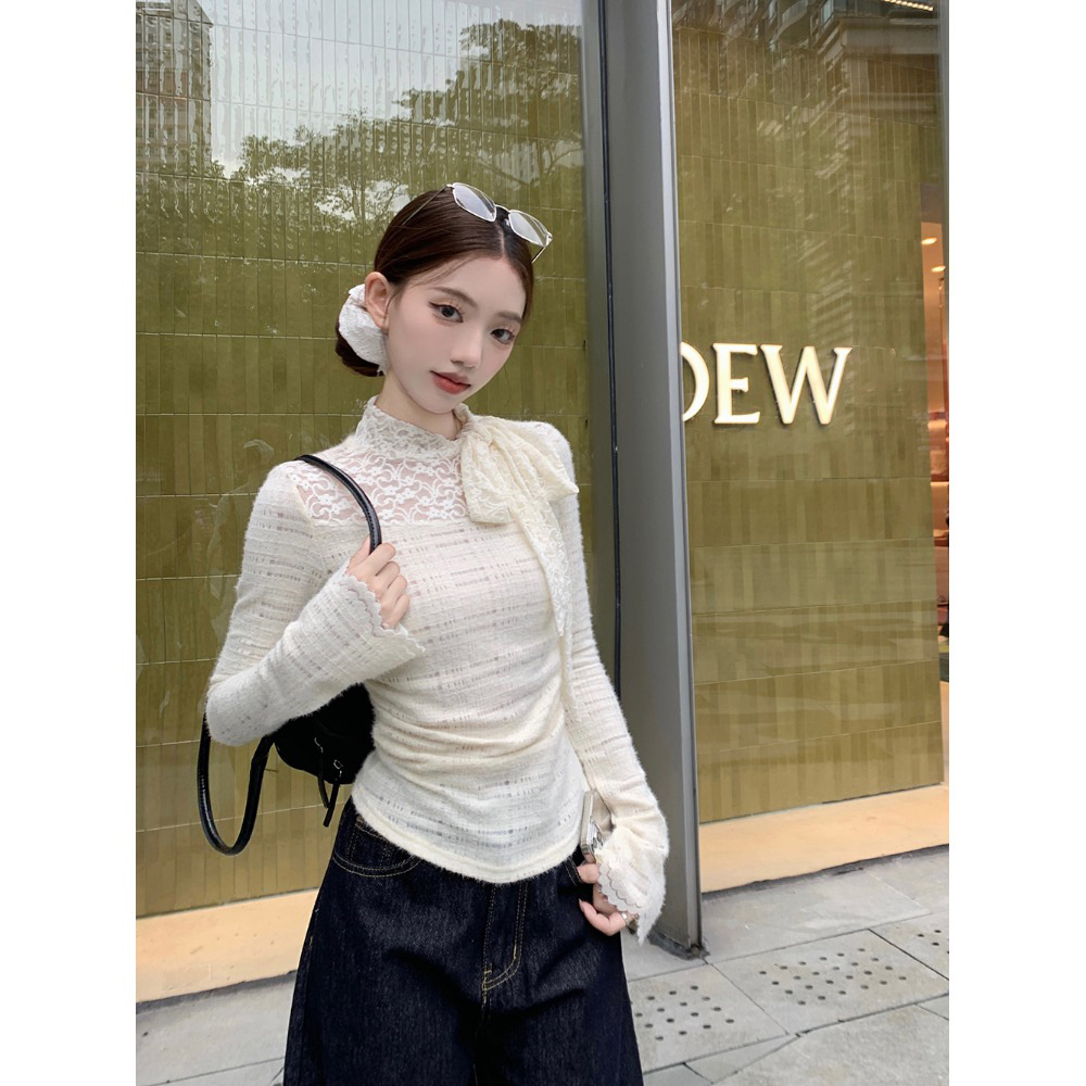 早秋时尚chic设计感甜辣妹内搭长袖个性蕾丝蝴蝶结修身显瘦上衣女