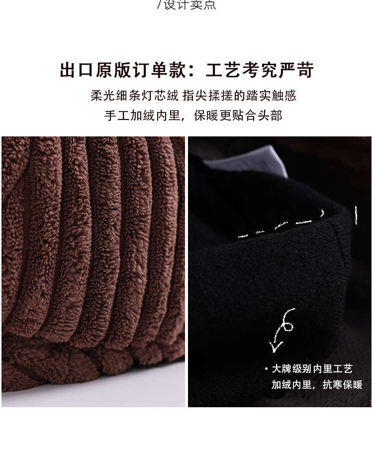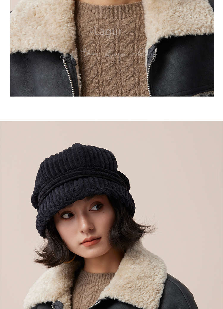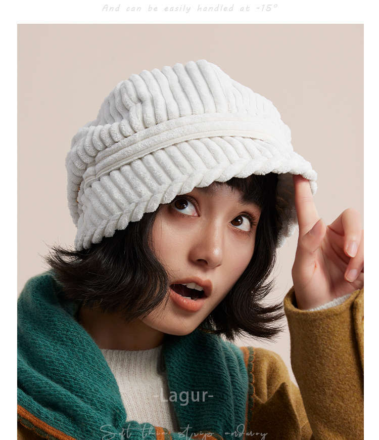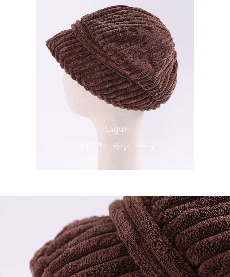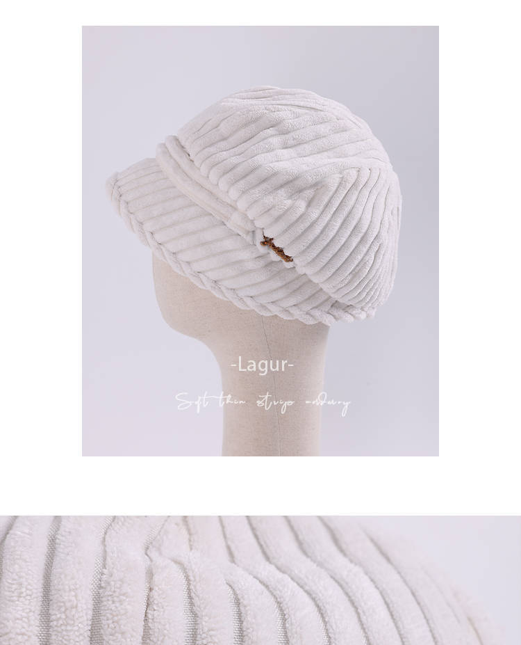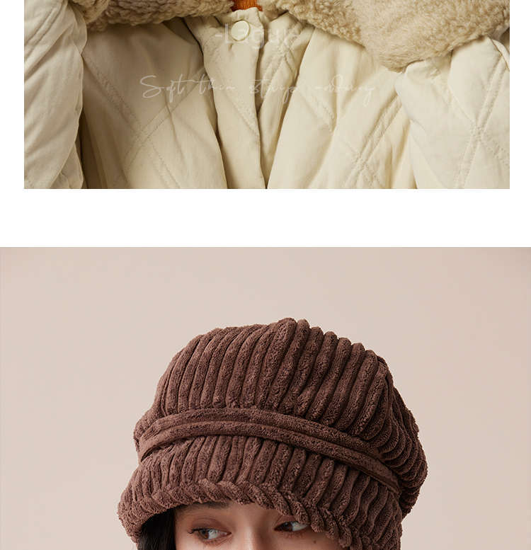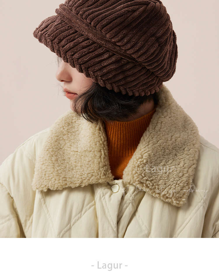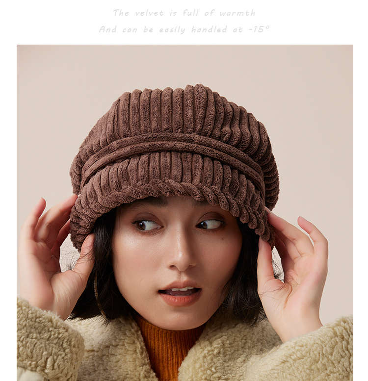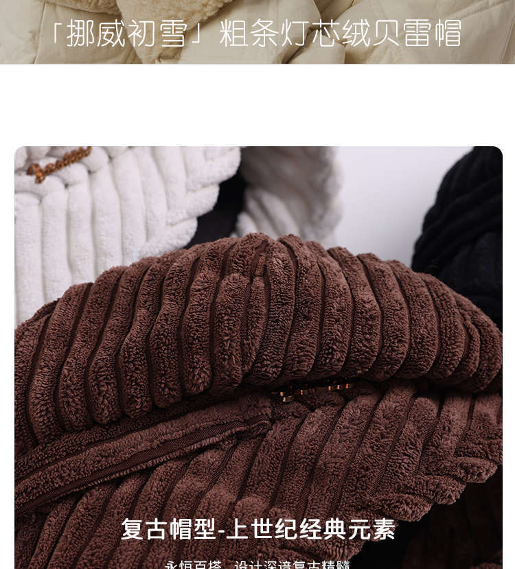 【ノルウェー初雪】レトロな太い条のコーデュロイとベルベットの保温ベレー帽が顔の小さな帽子を見せている秋冬の女性