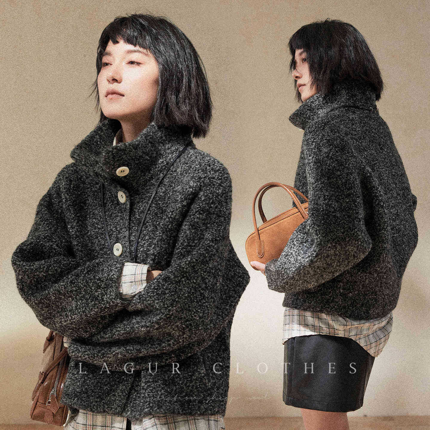 Lagur 极简阔型Ma*mara加厚毛衣100%羊毛纽扣开衫立领外套女冬季