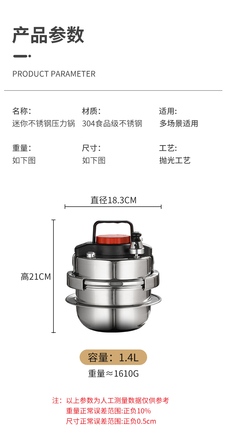 恒光越境食品グレード304ミニステンレス圧力鍋、ガス・電磁調理器対応、屋外・家庭用小型圧力鍋