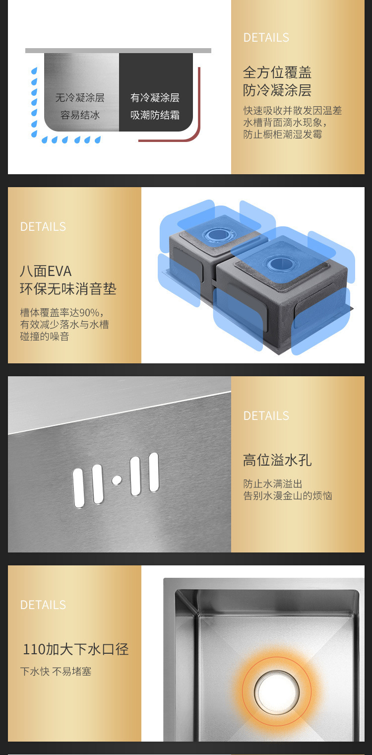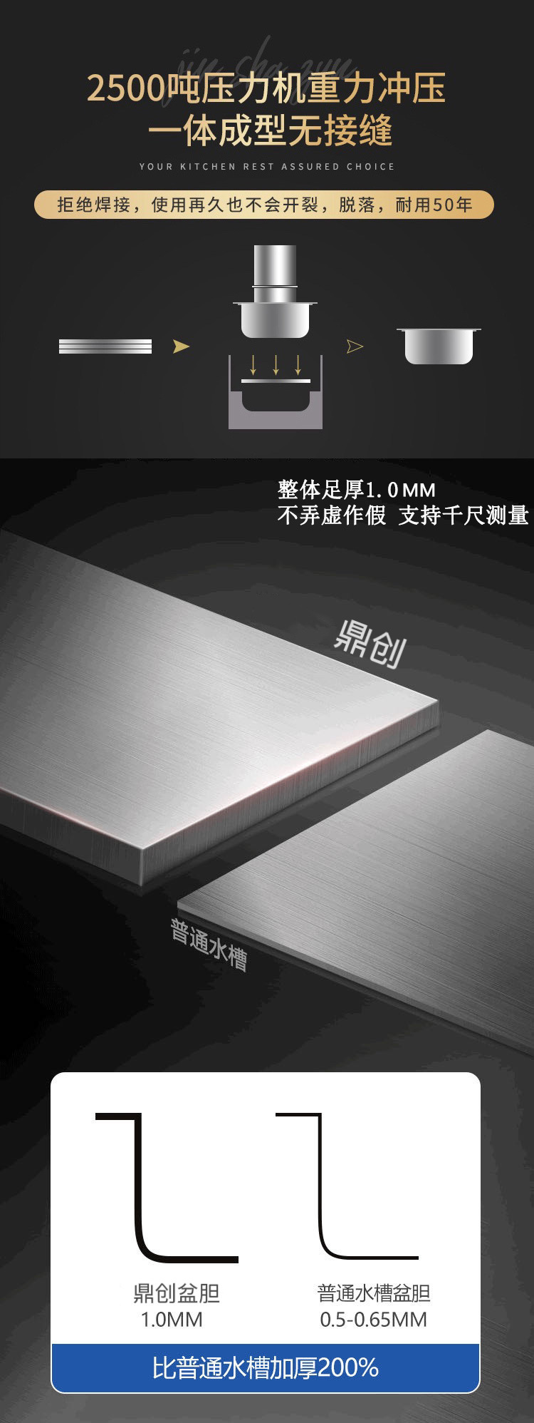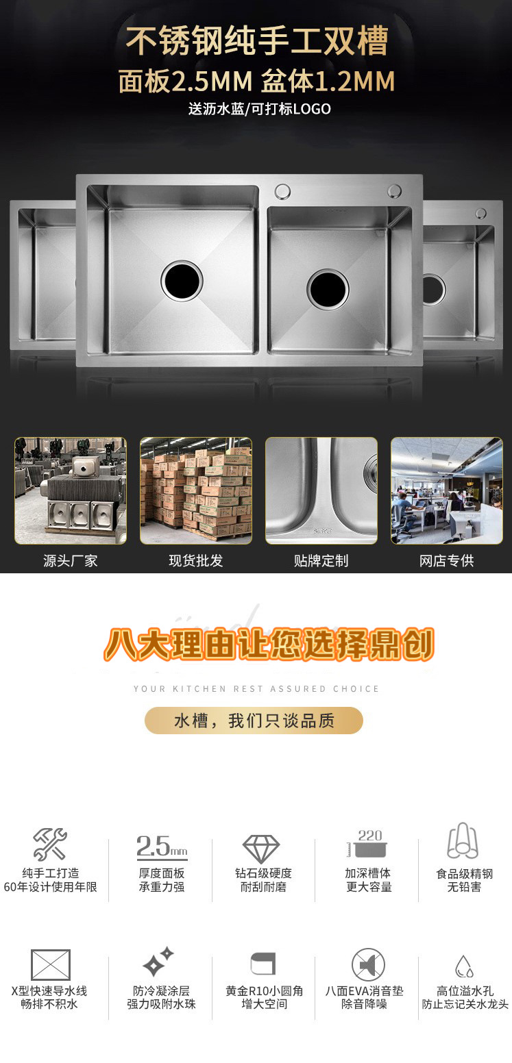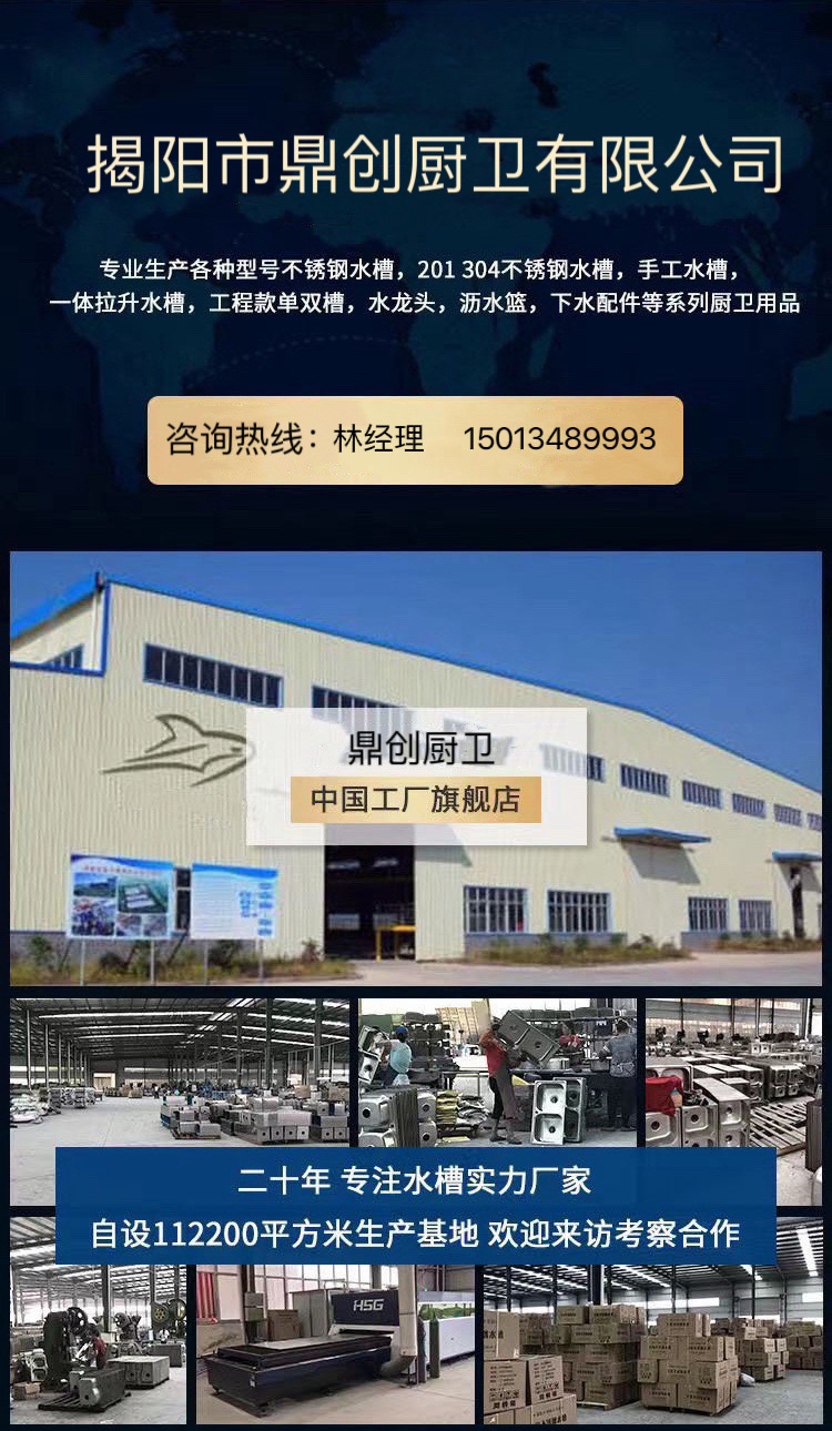 鼎创厨卫厂拥有强大的供货能力,专业生产水槽20余年,本店所有产品均为本厂自产自销,可定做任意尺寸形状,您需要的水槽尺寸我厂都可以加工定制,价格可根据数量商量,量大价优,质量绝对保证,不偷工减料,只为长期合作。