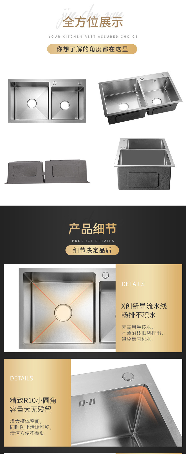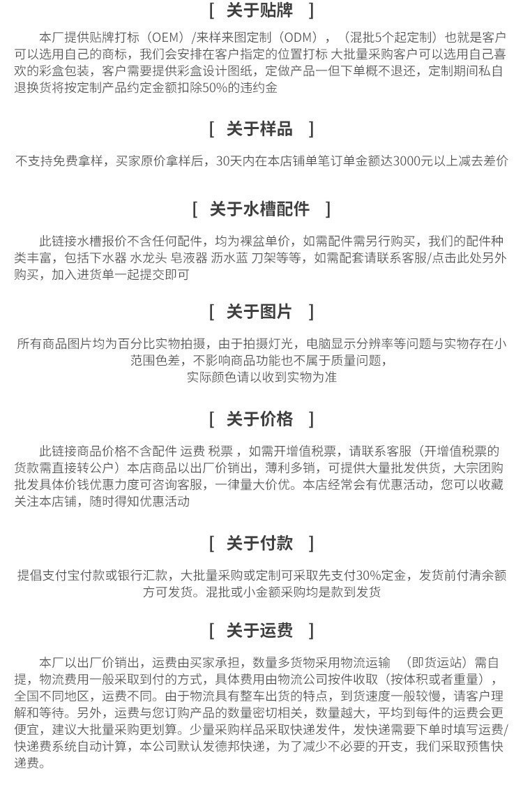 此款为201手工双槽裸盆价格,需要304的联系客服,都送有沥水篮(换伸缩沥水篮加2元)1个/箱,报价仅仅裸盆,不含配件运费税票,如需其他配件配套或开增值税票请联系客服咨询拍下