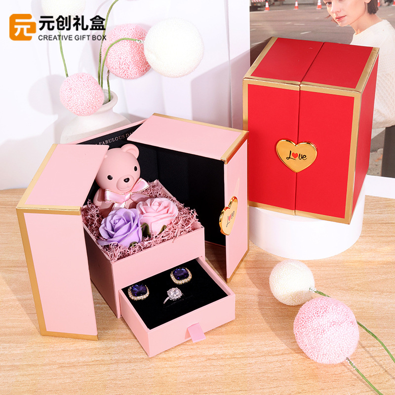 双层惊喜首饰品双开门礼盒玫瑰花小熊公仔首饰盒戒指项链珠宝包装