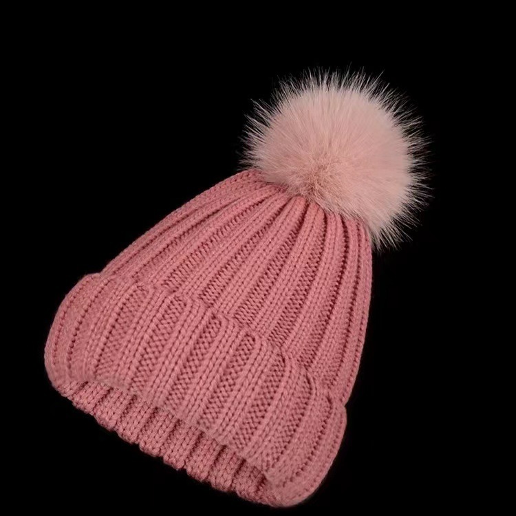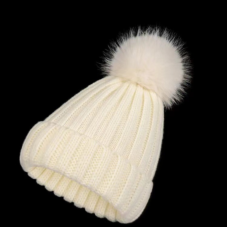 女性用卸売耳保護ニット帽、韓国版ラクーンファーボール付きウール帽子、女性用厚手暖かいファー帽子、ドーム型