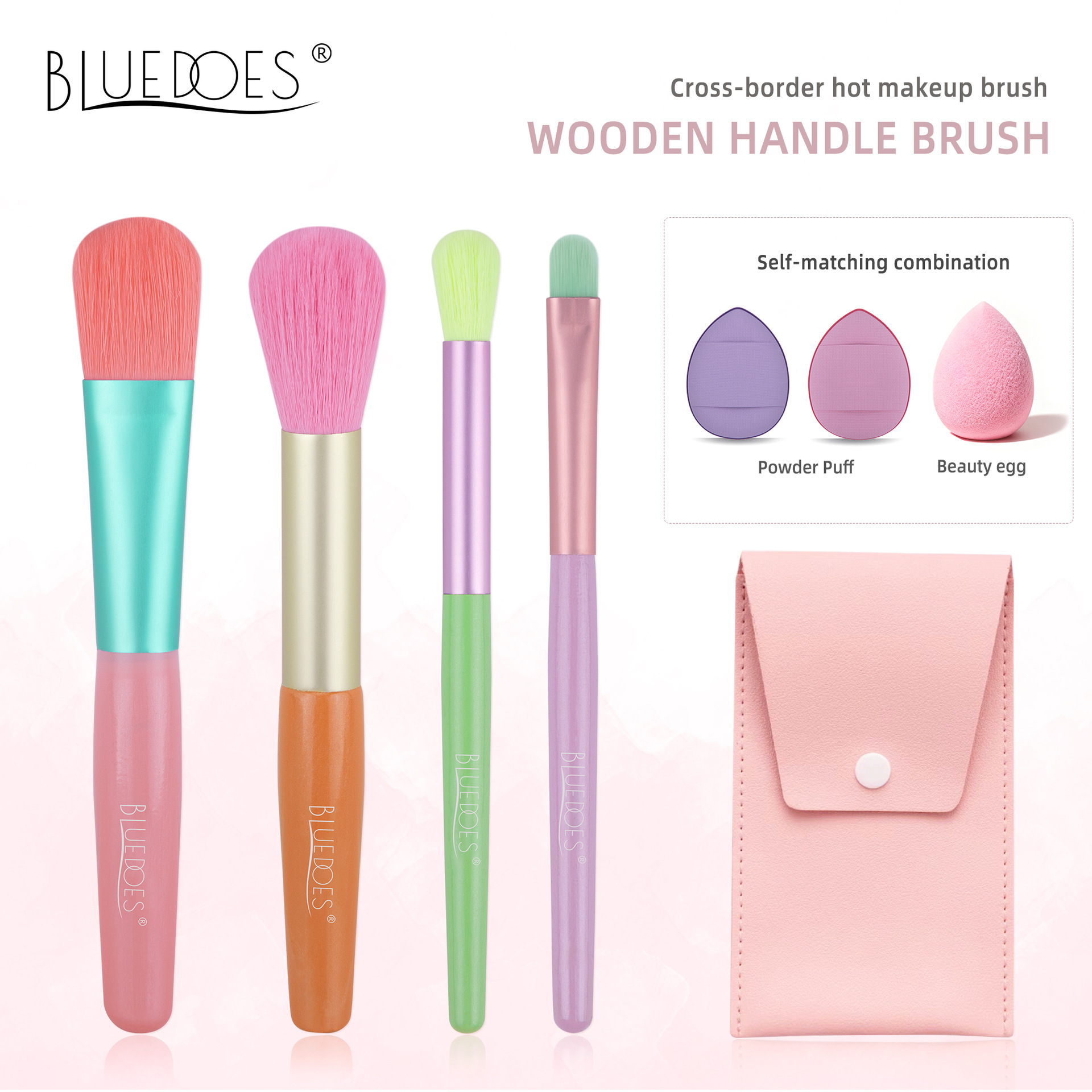 跨境化妆刷4支糖果色木柄眼影刷粉底刷美妆蛋粉扑化妆包组合批发