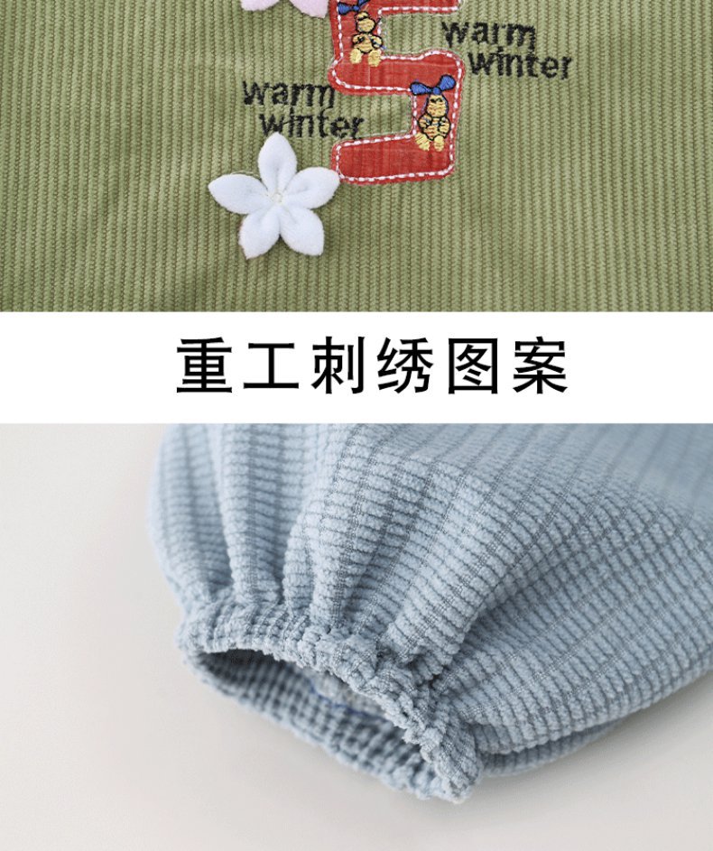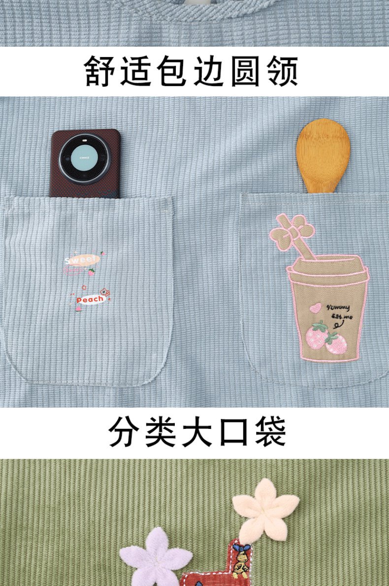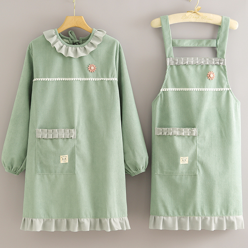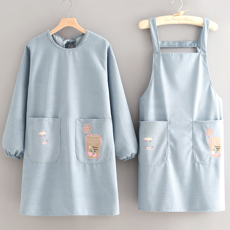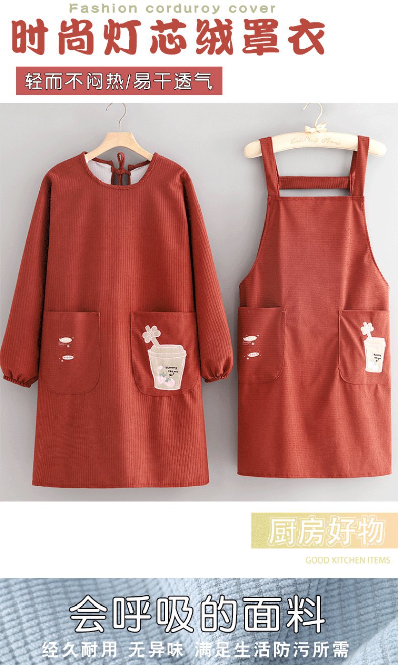 家庭用キッチン用のスタイリッシュな韓国風コーデュロイ長袖エプロン、かわいい防汚調理用高級つなぎ服