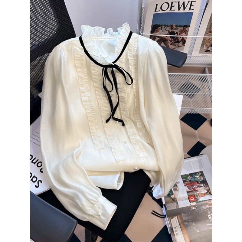 小香風蝶結びシャツ女性春秋優しい木耳辺フランスレトロ宮廷系長袖シフォン上着