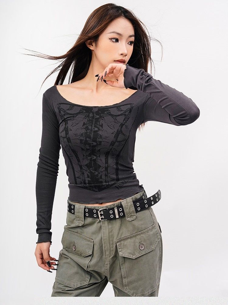 アメリカのレトロなギャル風の正肩の長袖のtシャツの女性の秋の新型の肩を露出して身を修めるのはやせています。