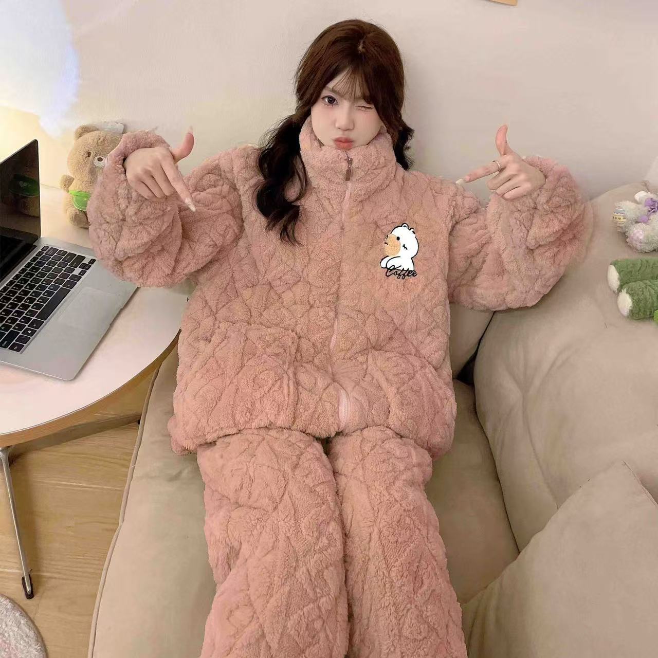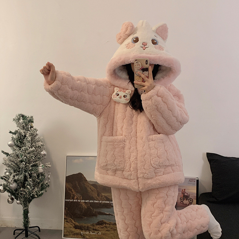 三层夹棉珊瑚绒睡衣女秋冬新款卡通休闲宽松甜美家居服套装可外穿